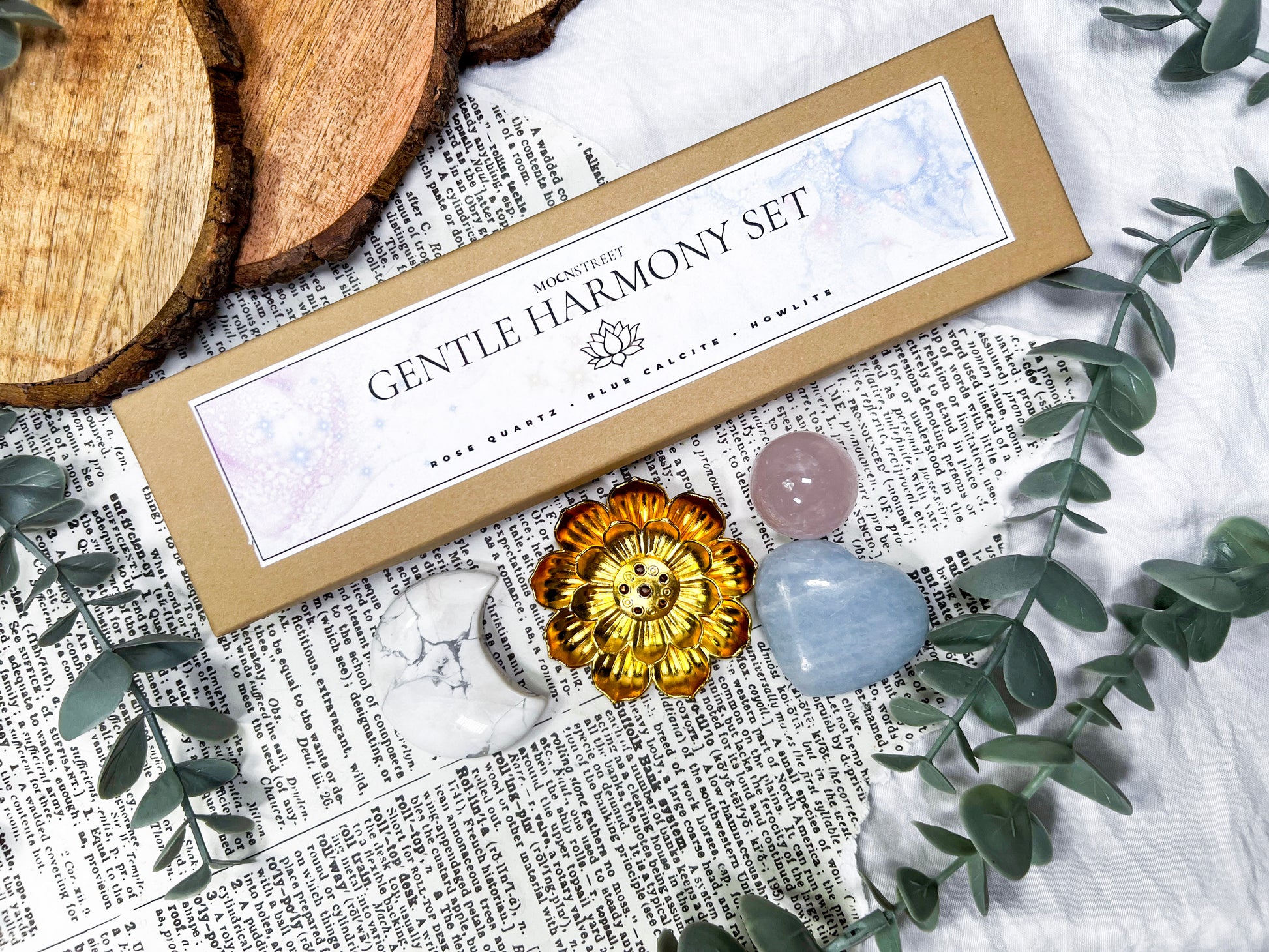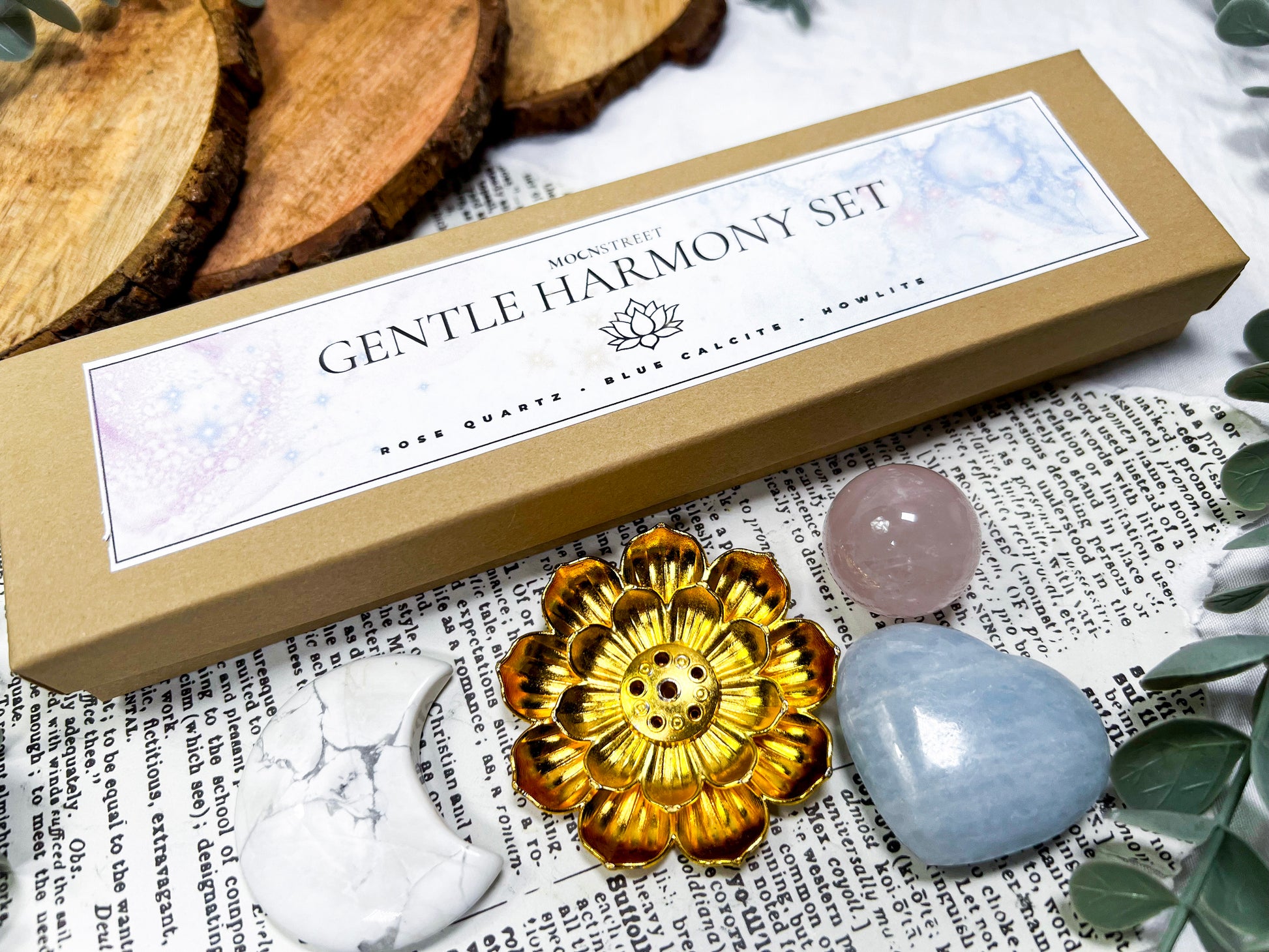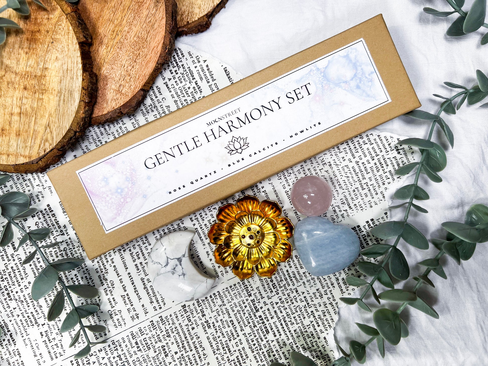 The Peace and Love Crystal Set was created to calm the spirit and open the heart. Housed in a 2x8 inch box, this set includes a rose quartz sphere for love and compassion, a blue calcite heart for soothing communication, and a howlite moon for rest and emotional balance. A gold lotus incense holder completes the set, adding warmth and sacred tranquility to any space.