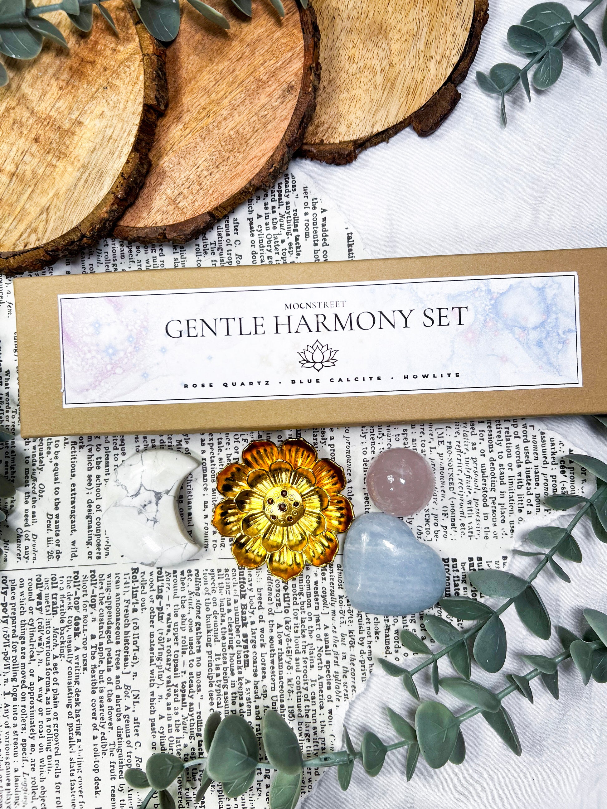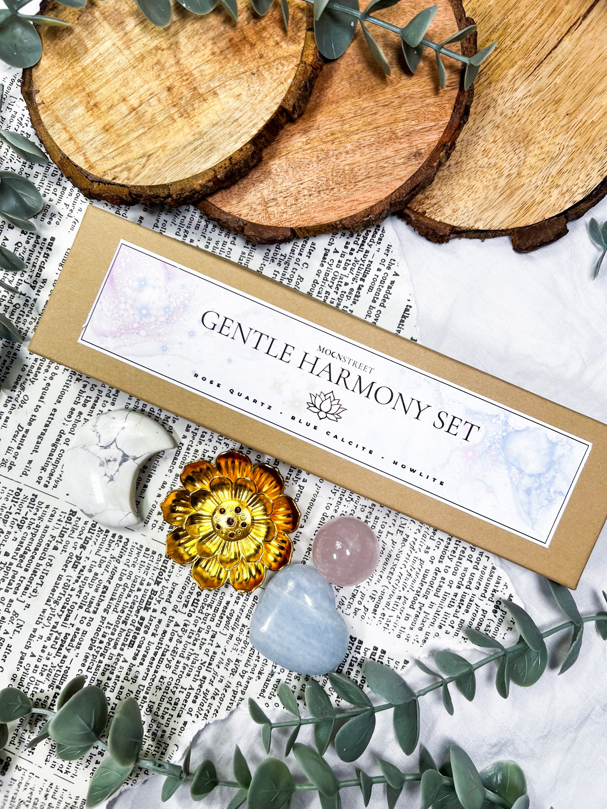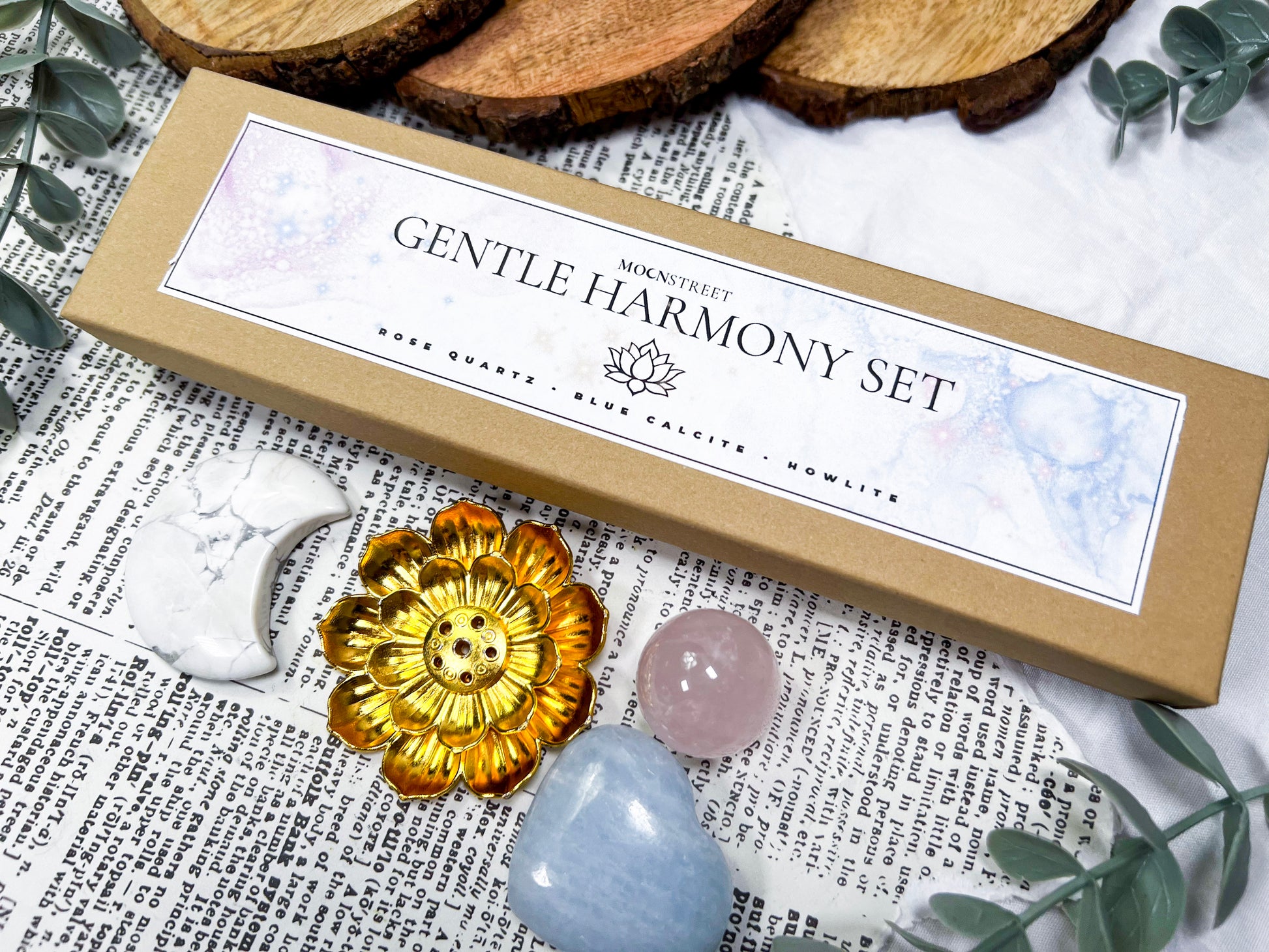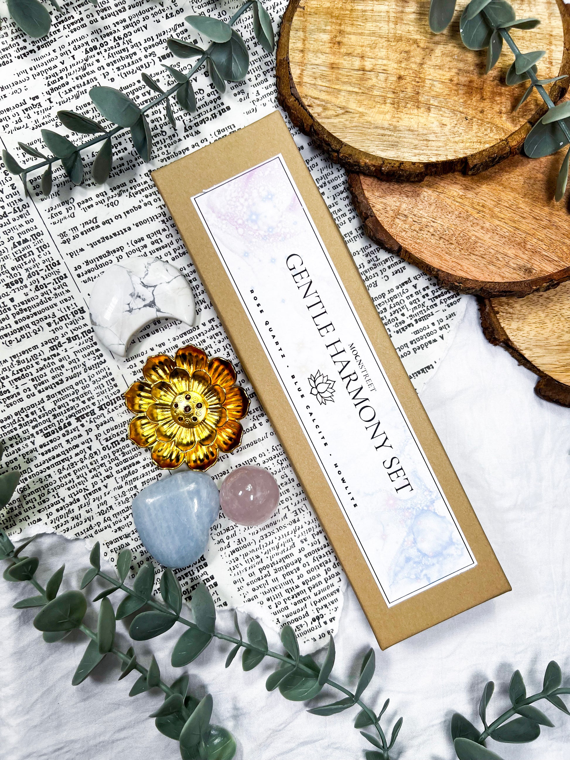 The Peace and Love Crystal Set was created to calm the spirit and open the heart. Housed in a 2x8 inch box, this set includes a rose quartz sphere for love and compassion, a blue calcite heart for soothing communication, and a howlite moon for rest and emotional balance. A gold lotus incense holder completes the set, adding warmth and sacred tranquility to any space.