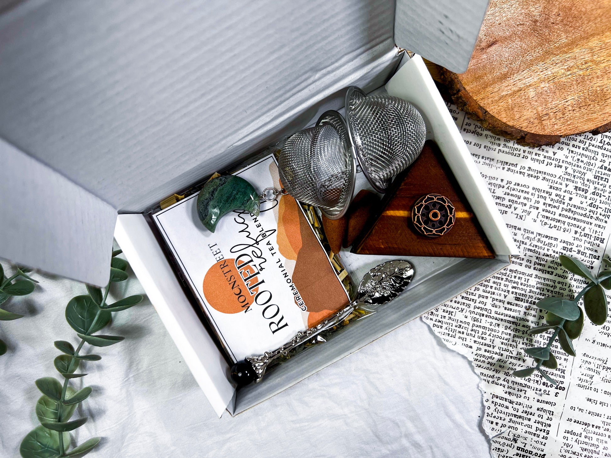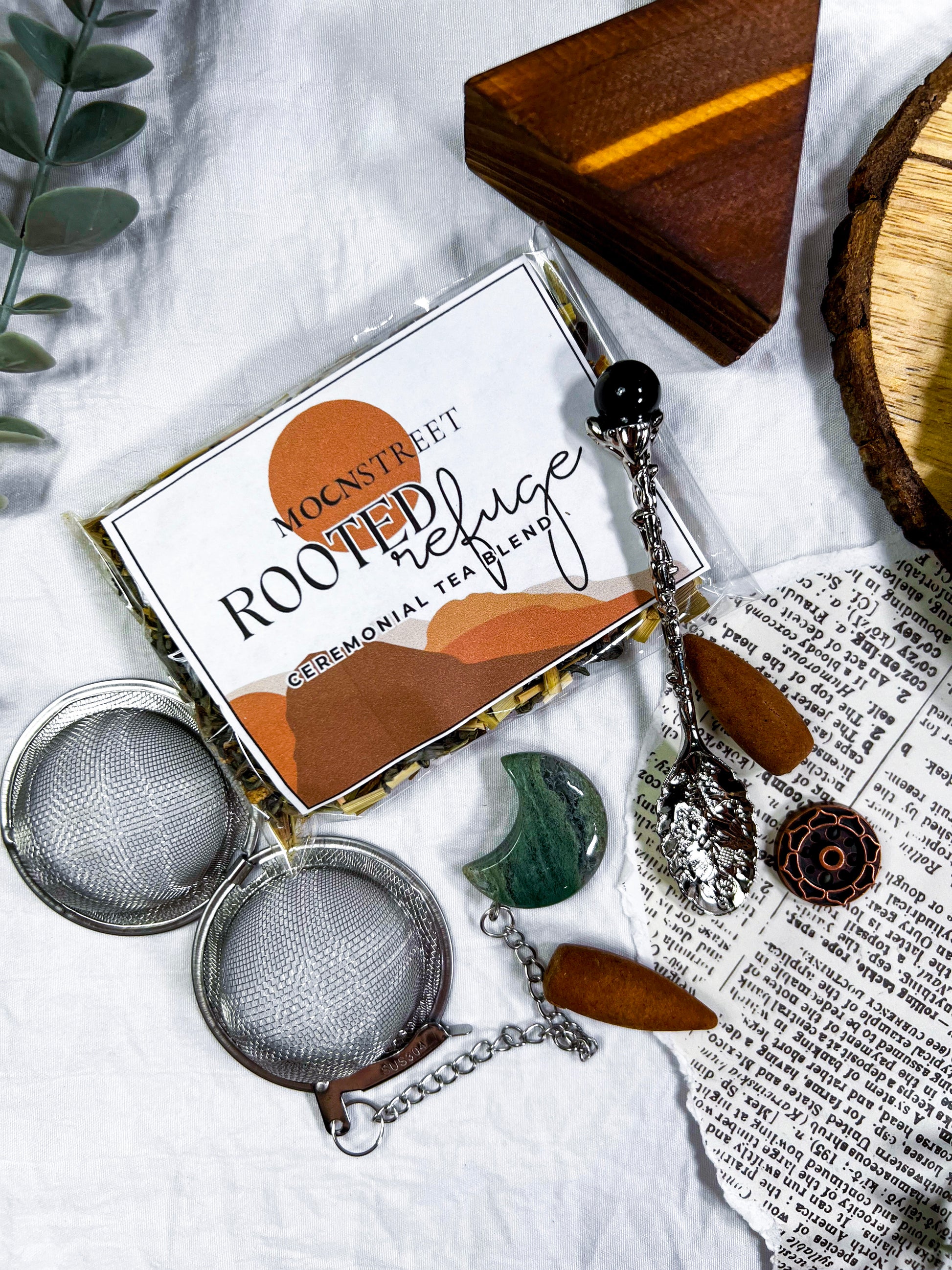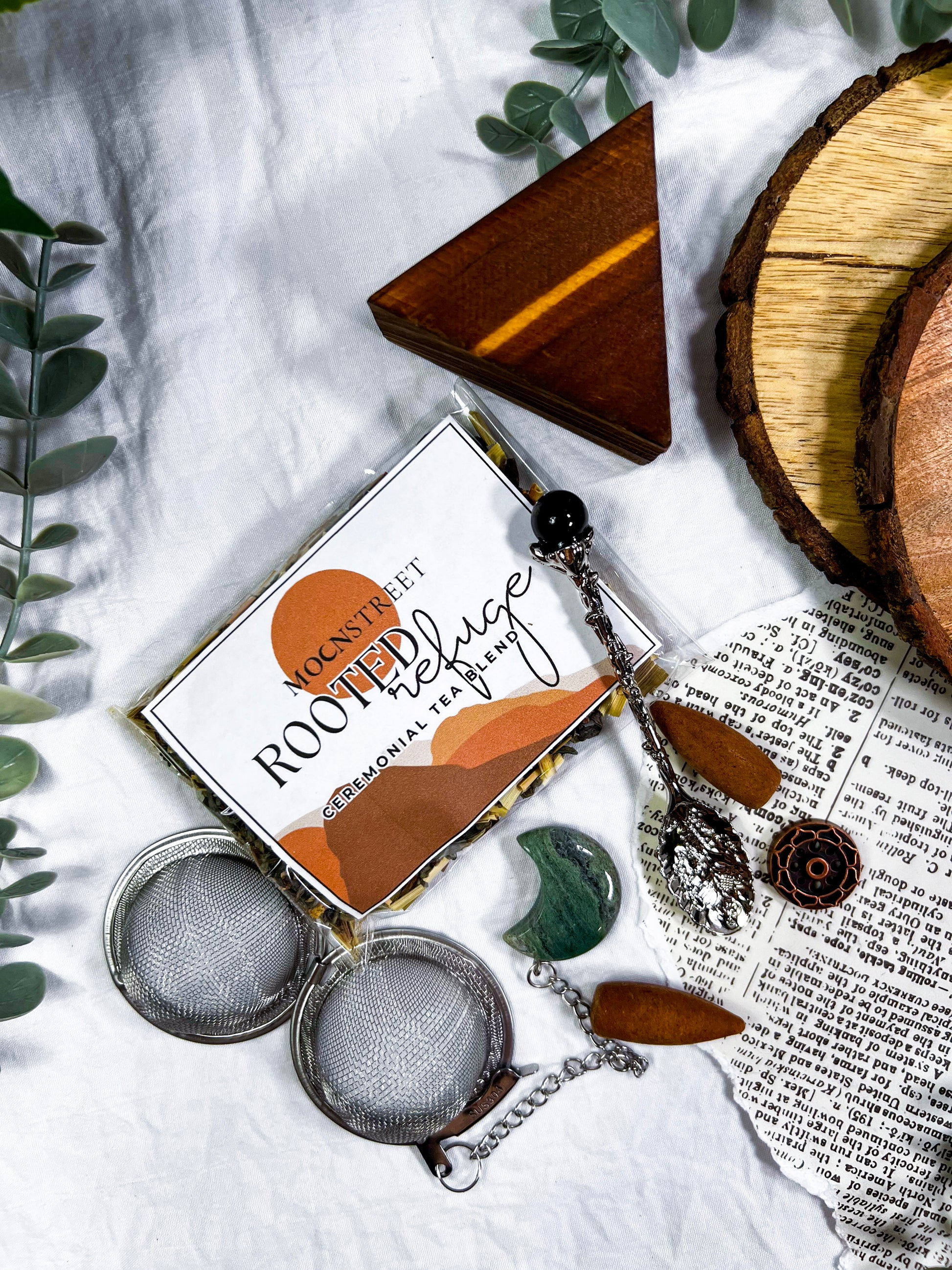vibes: grounding • tea ritual • ceremonial tea kit • moss agate • tarot ritual • mindful witch • cozy magic • meditation set • self care witchcraft • earthy calm • slow ritual