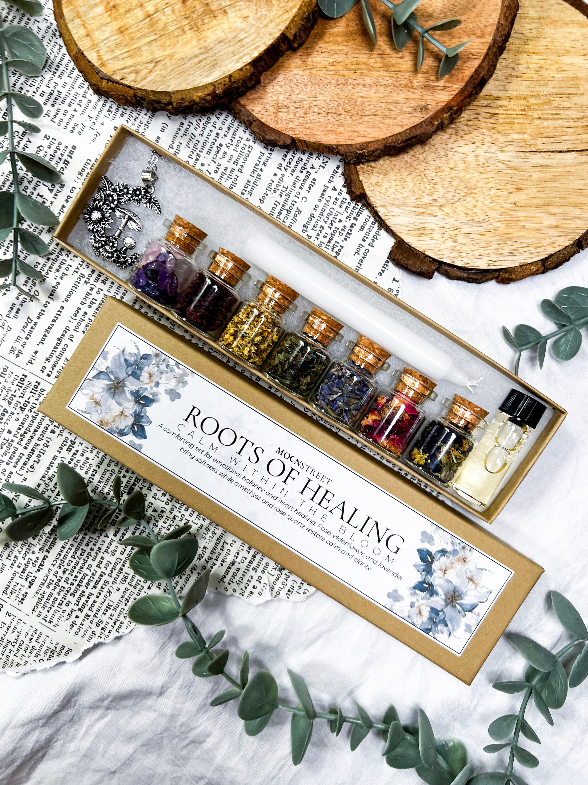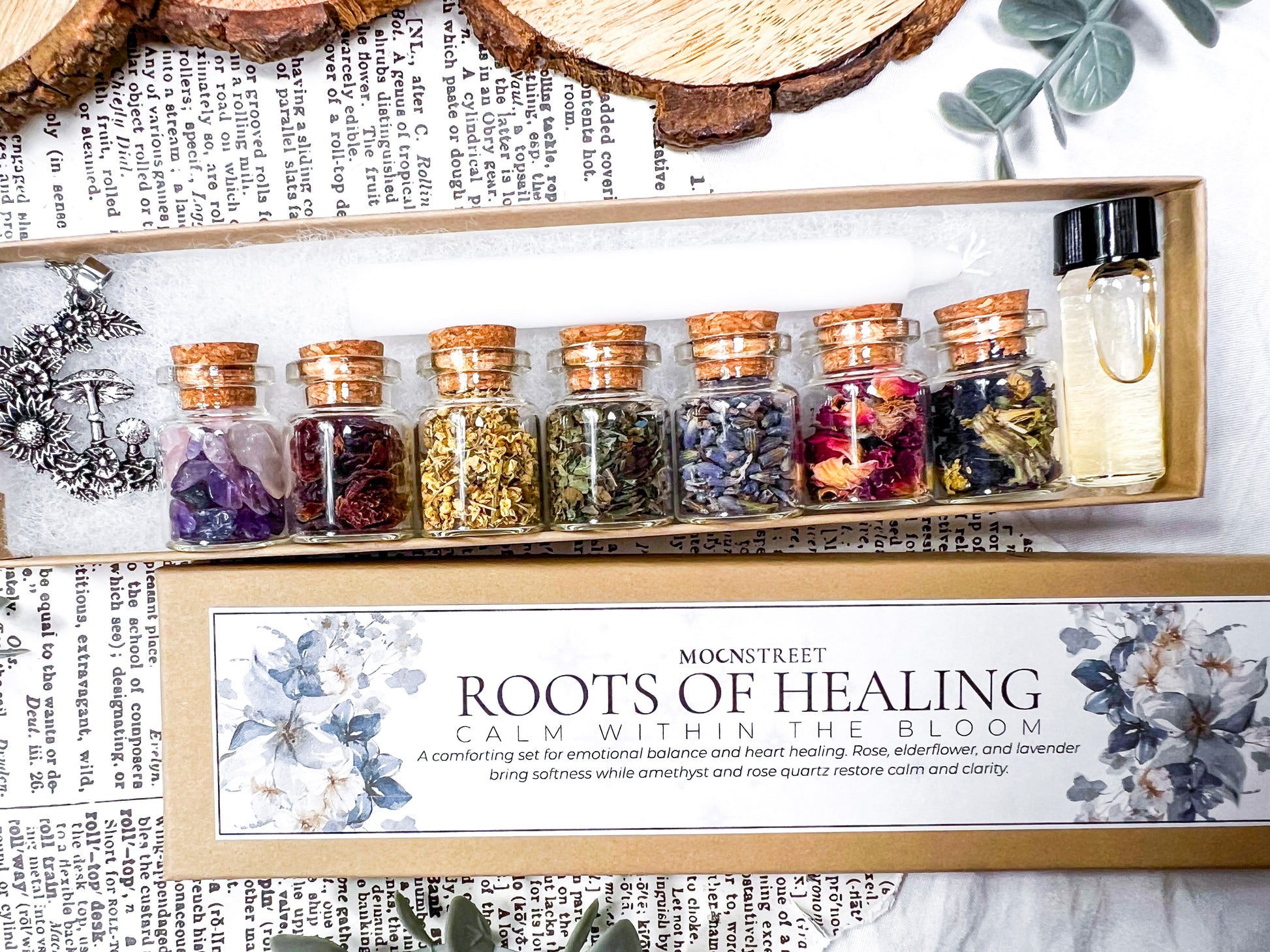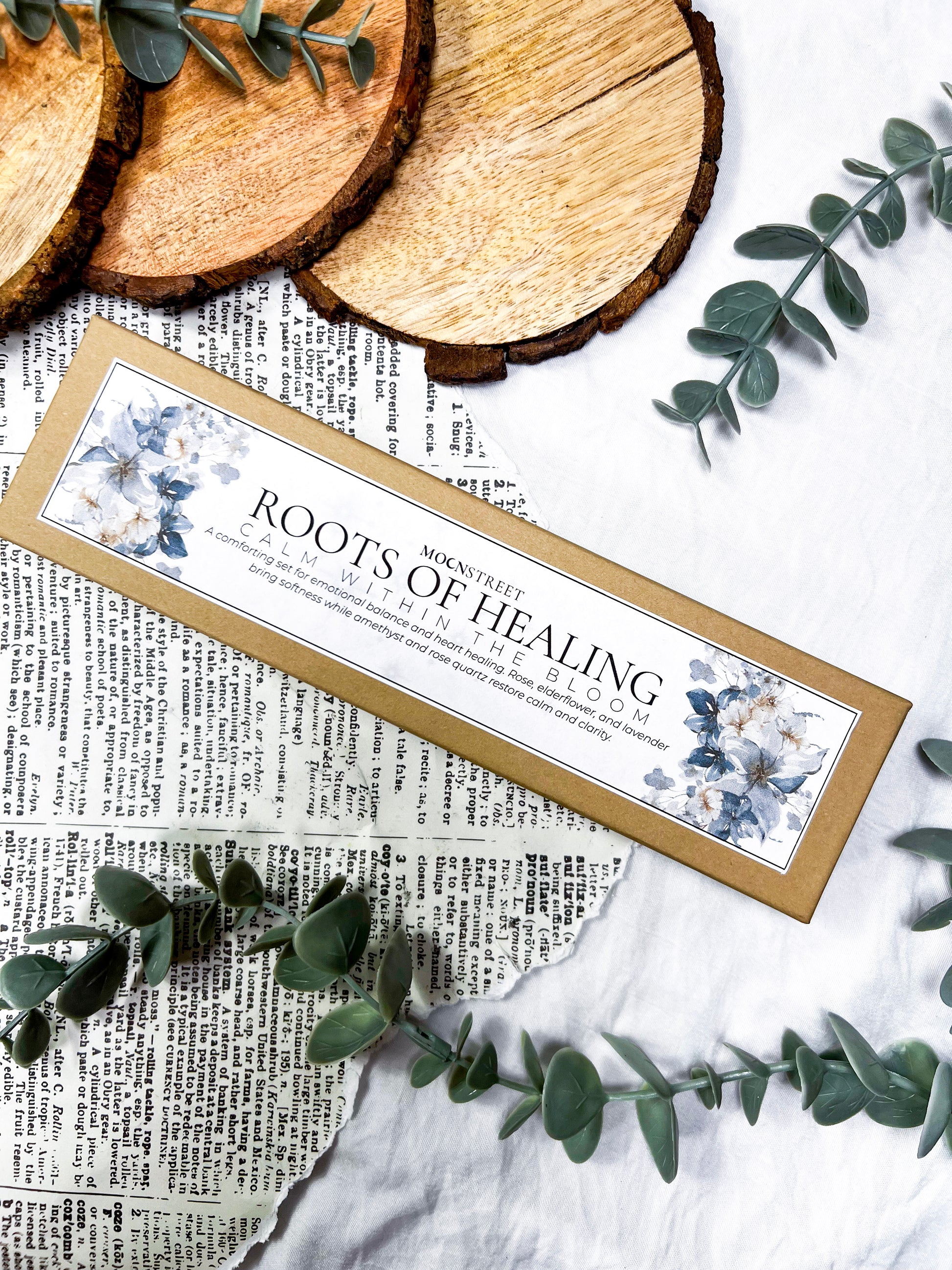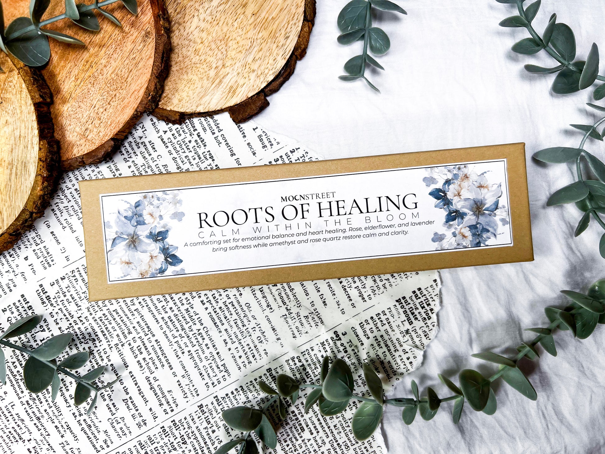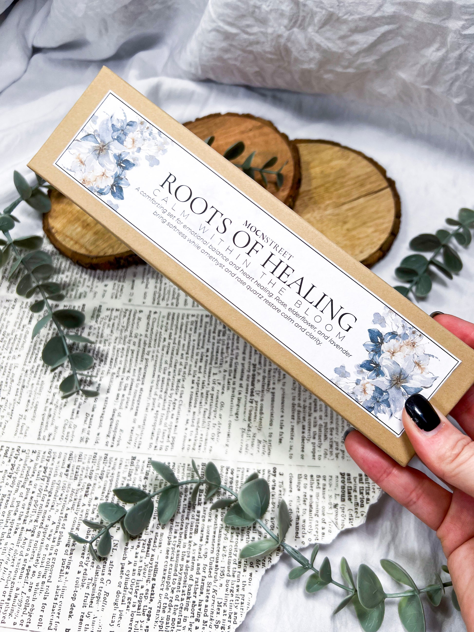 Roots of Healing was created to support emotional balance and soft recovery. Each set includes an Emotional Calm Oil, a white candle, a crystal mix of rose quartz, amethyst, and blue lace agate, and a gentle herbal blend of rose hips, elderflower, lemon balm, lavender, rose, and butterfly pea.