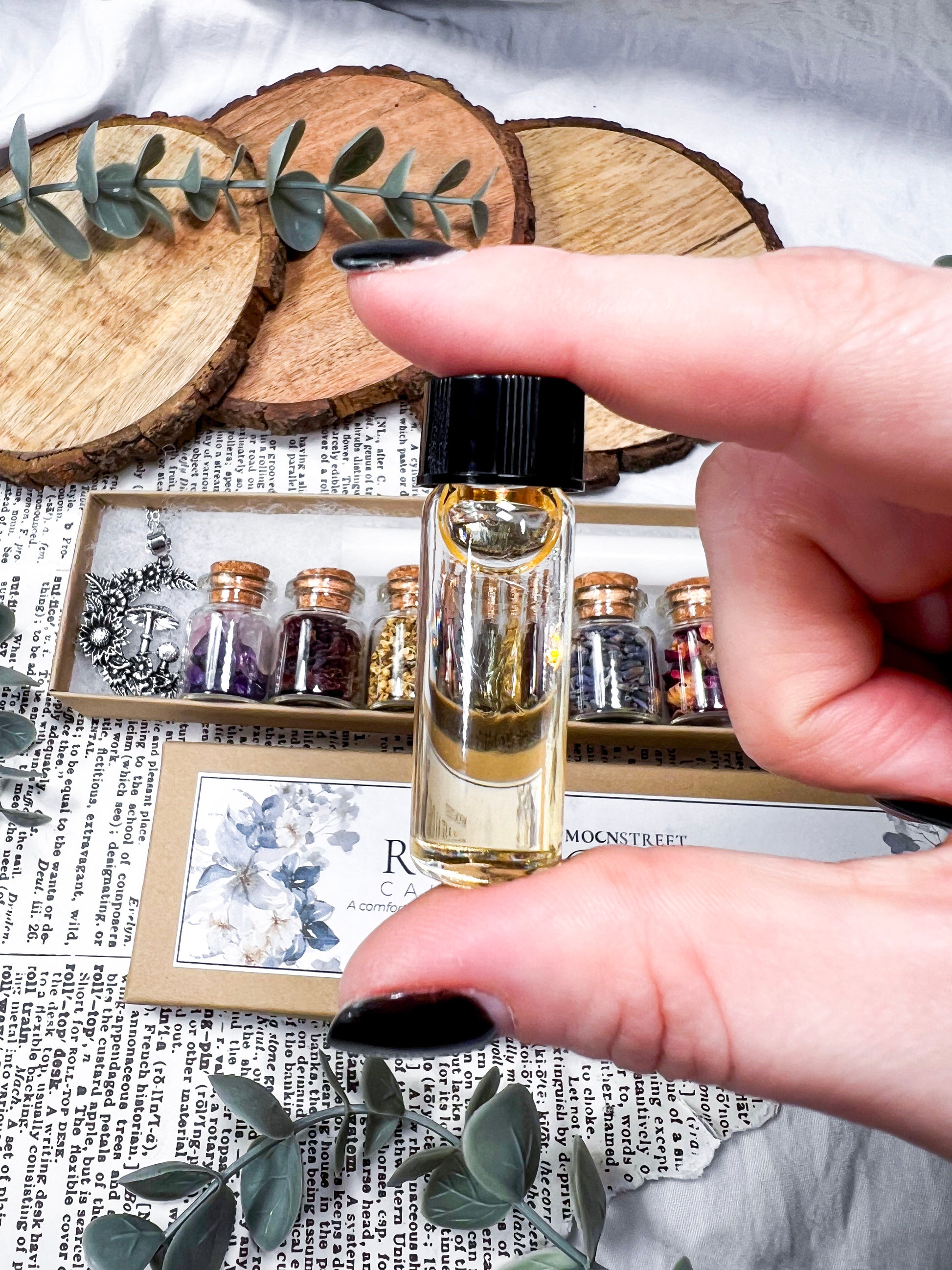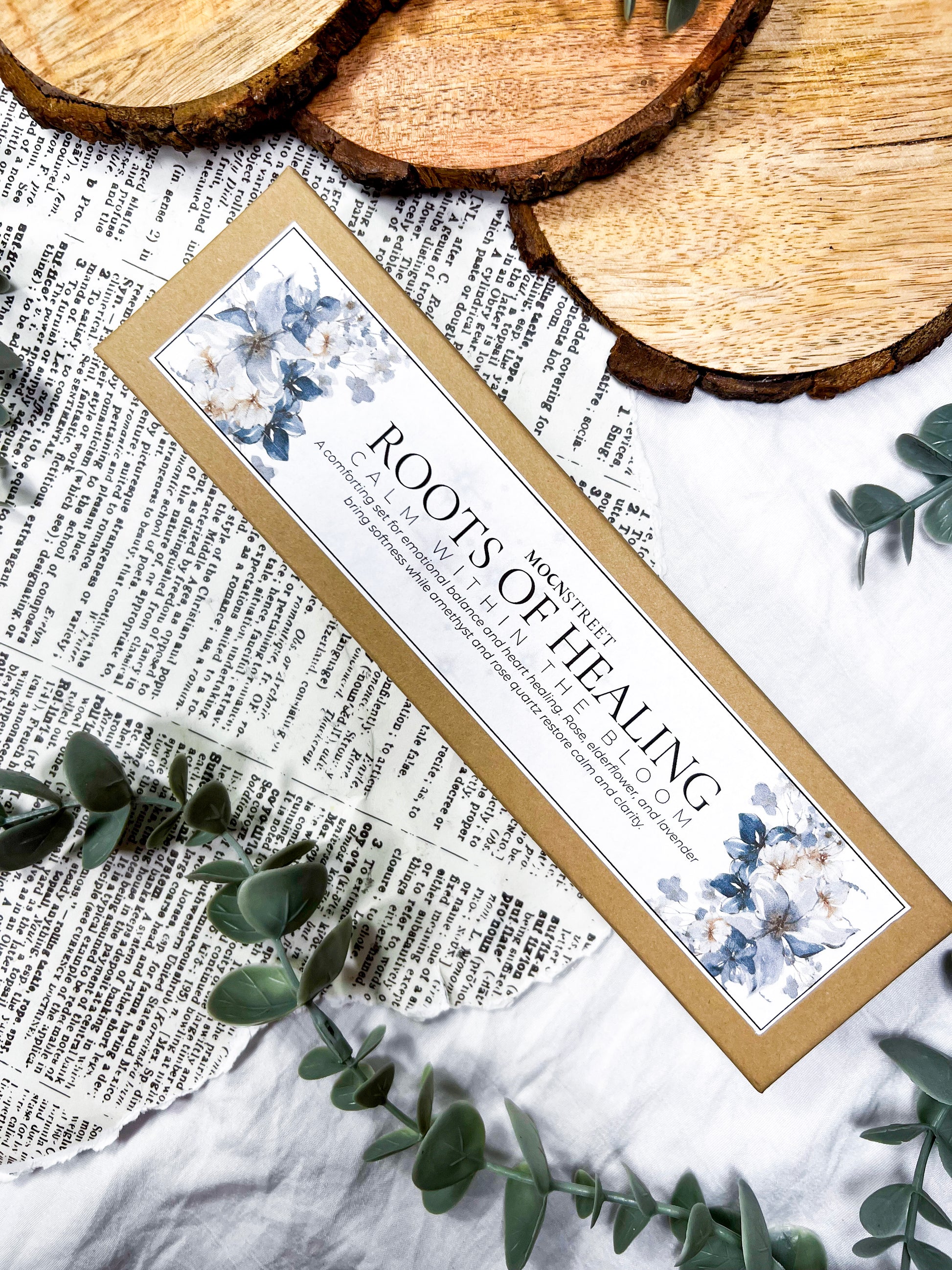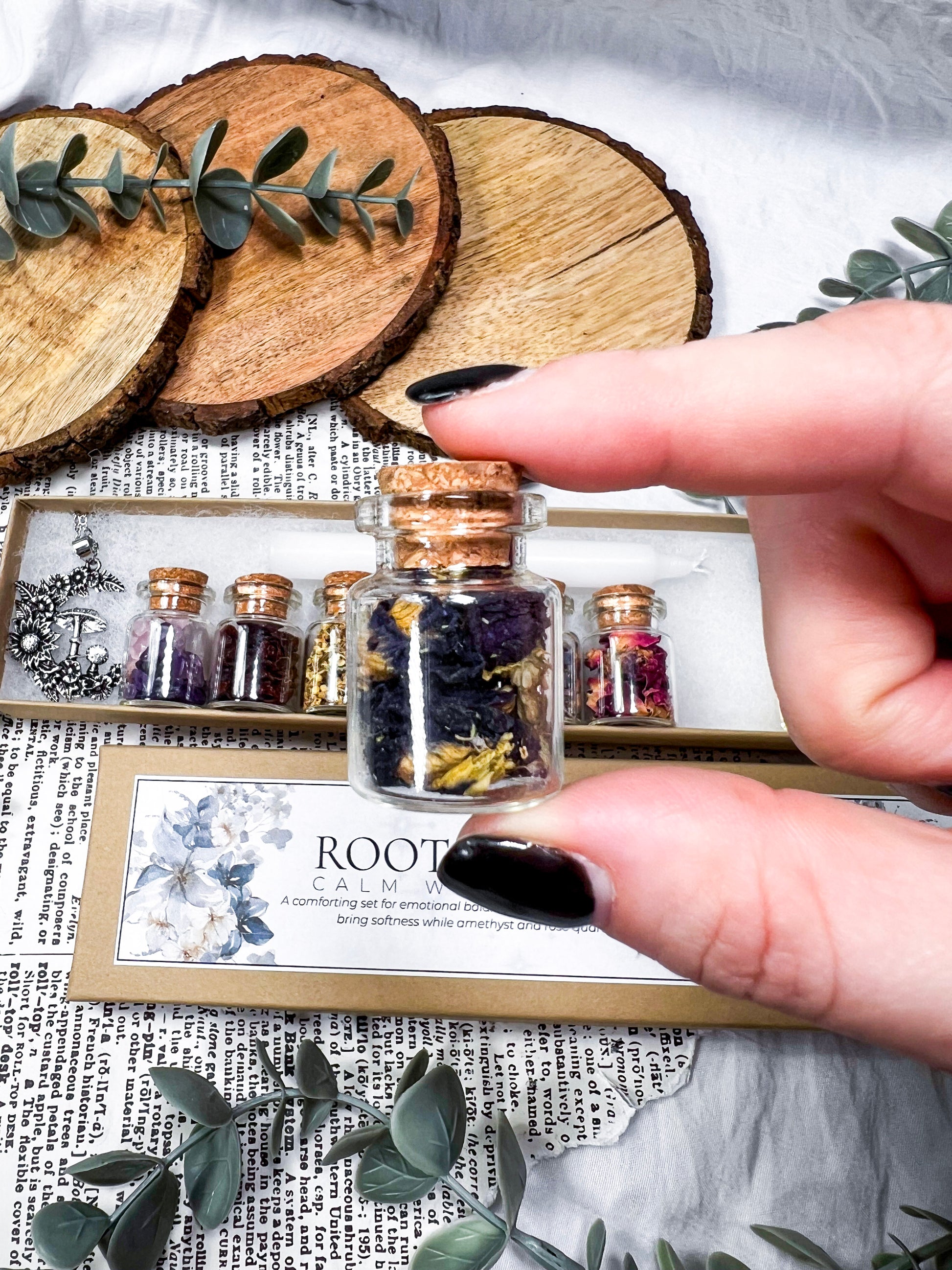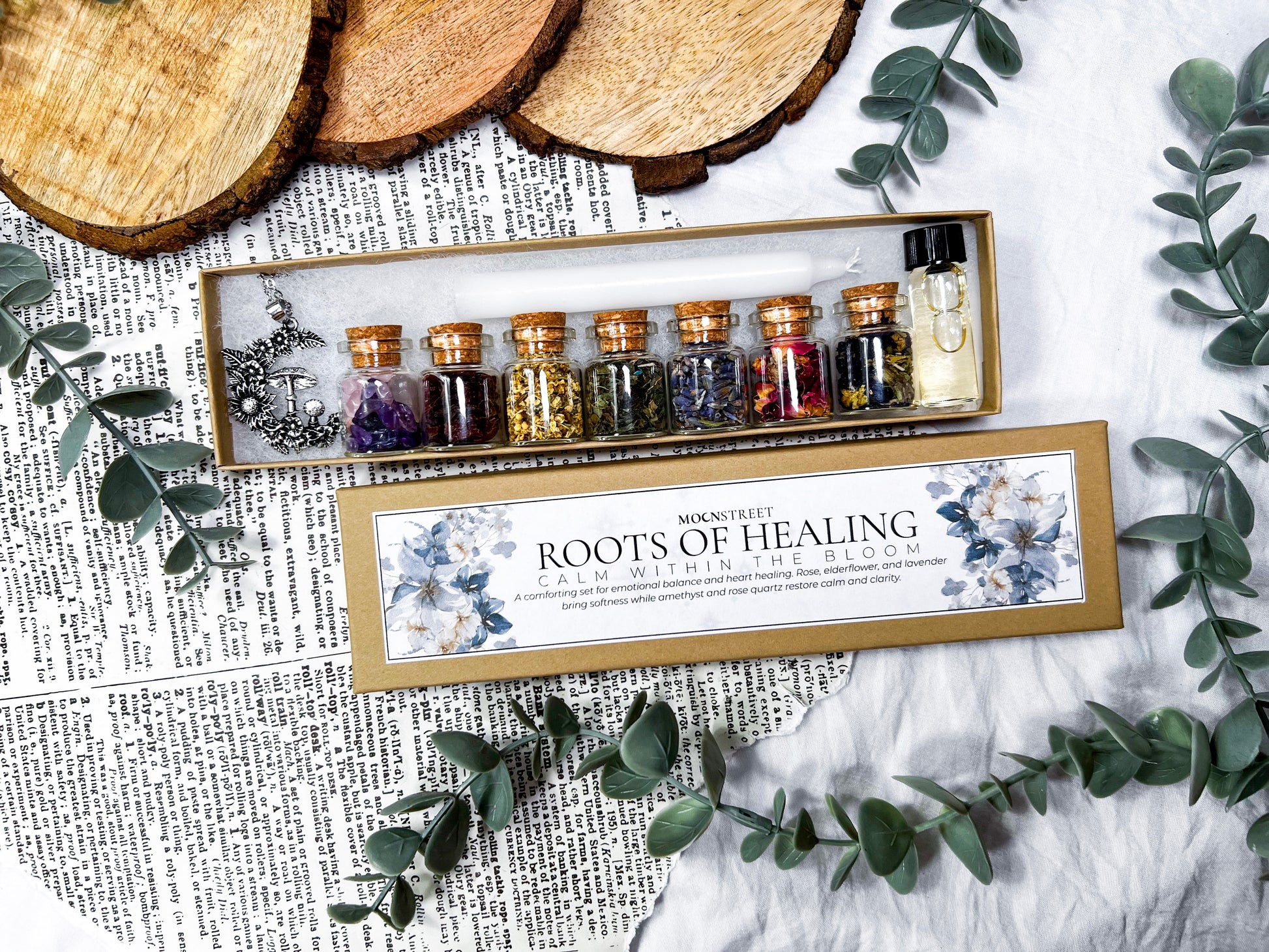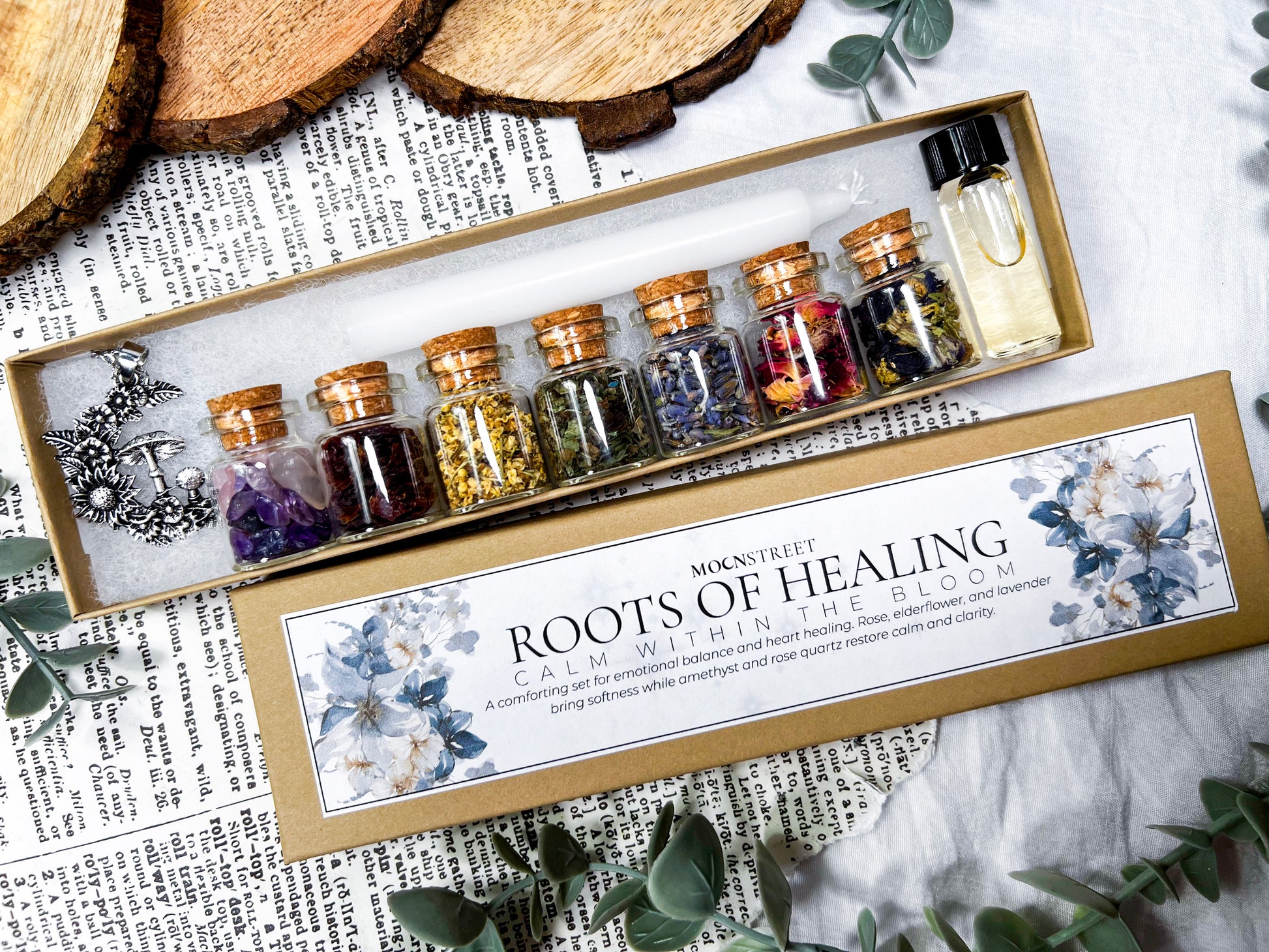 Roots of Healing was created to support emotional balance and soft recovery. Each set includes an Emotional Calm Oil, a white candle, a crystal mix of rose quartz, amethyst, and blue lace agate, and a gentle herbal blend of rose hips, elderflower, lemon balm, lavender, rose, and butterfly pea.
