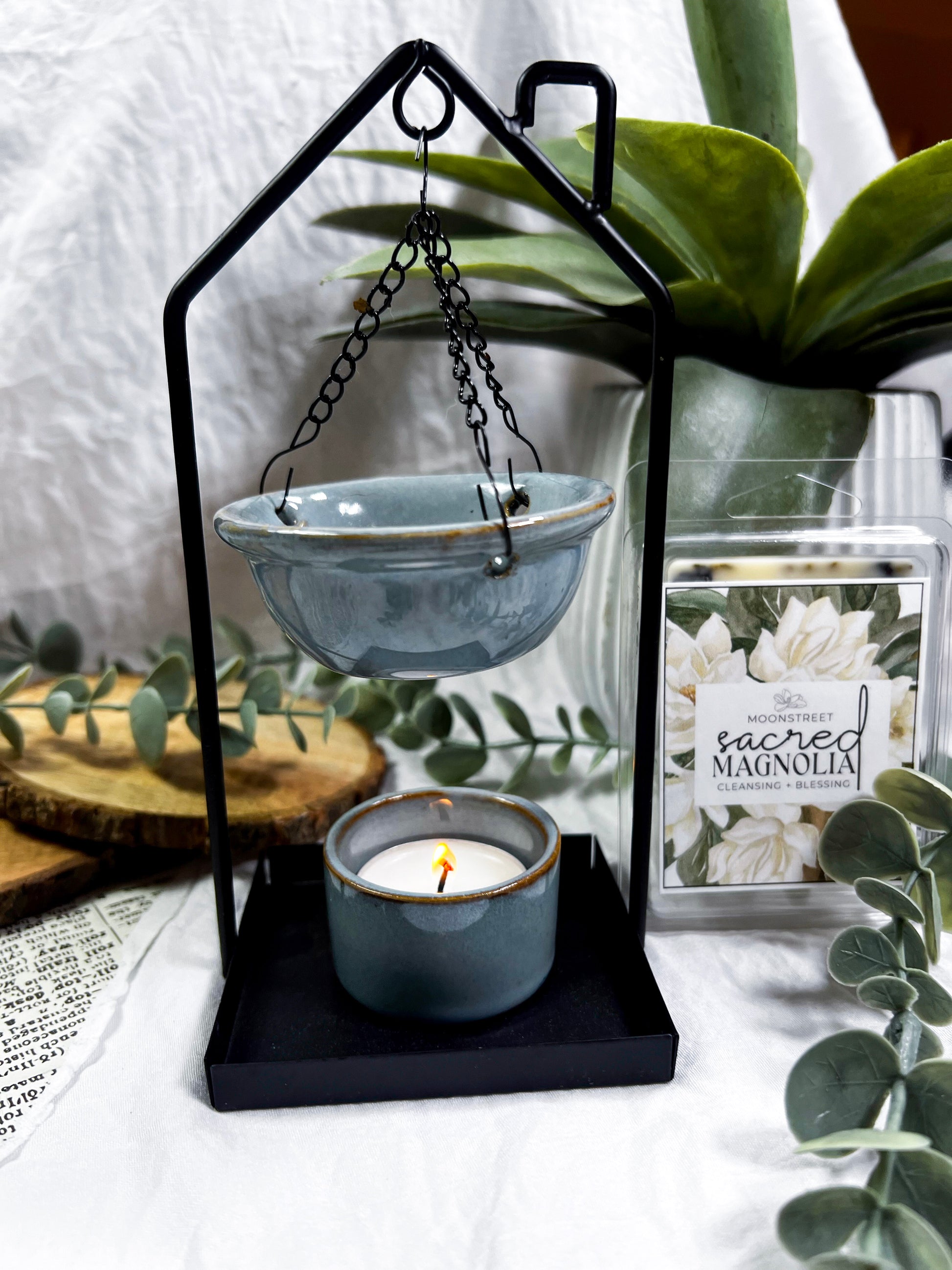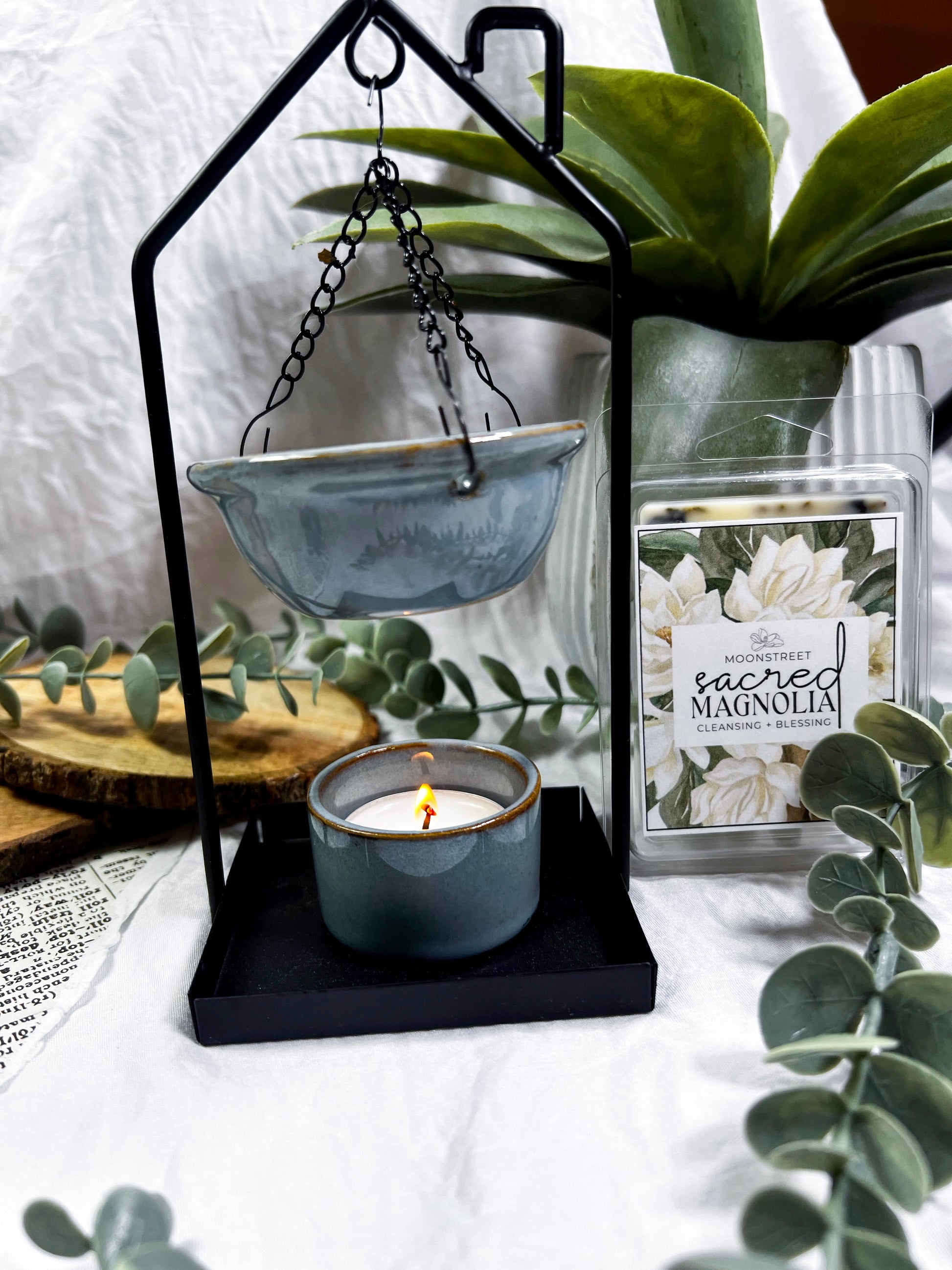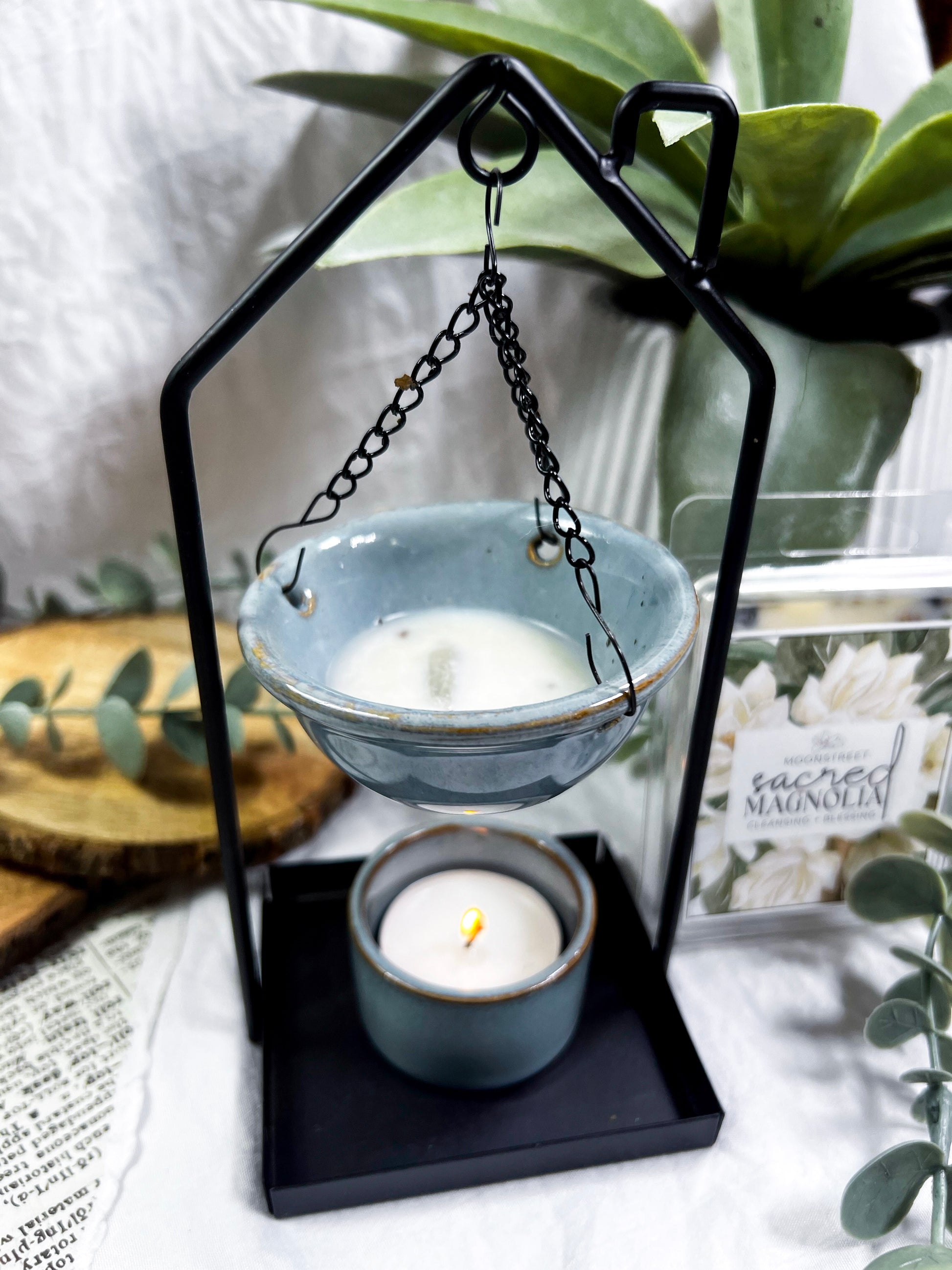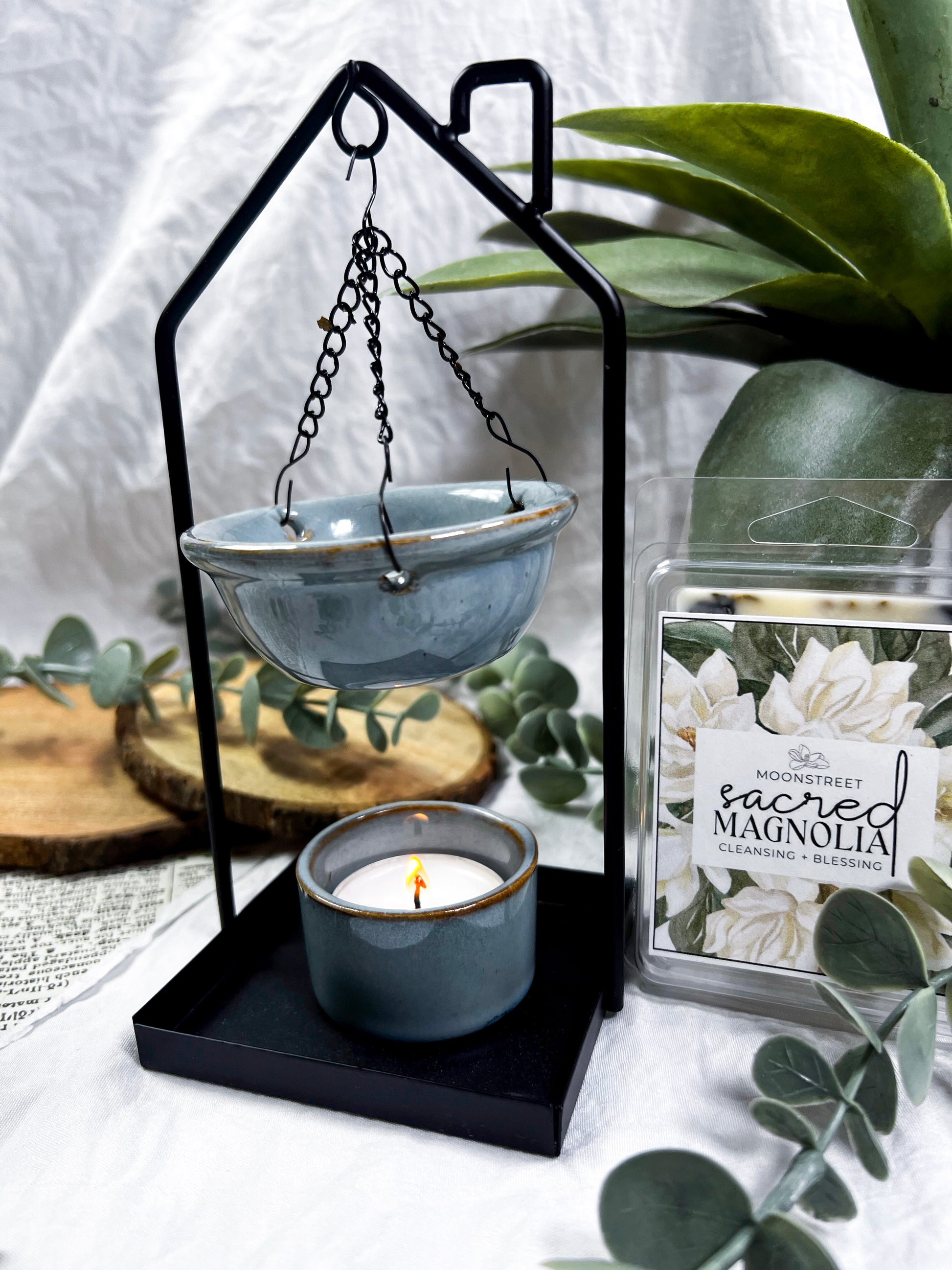 The Sacred Magnolia Wax Melt and House Melter Set is designed to cleanse and bless your space with soft, floral warmth and steady grounding energy. The ceramic melter is shaped like a little house and comes in assorted colors, standing around seven inches tall with a three to four inch width. It features a built in tealight holder and removable ceramic bowl, creating a cozy glow as the melts release their intention. Each wax melt is scented with a blend of high tea, peony, magnolia, frangipani, burdock root, sophora flower, and pine, and every cavity holds a clear quartz point to amplify your cleansing and peace based work. Together, the set brings calm, comfort, and fresh energy into any room.