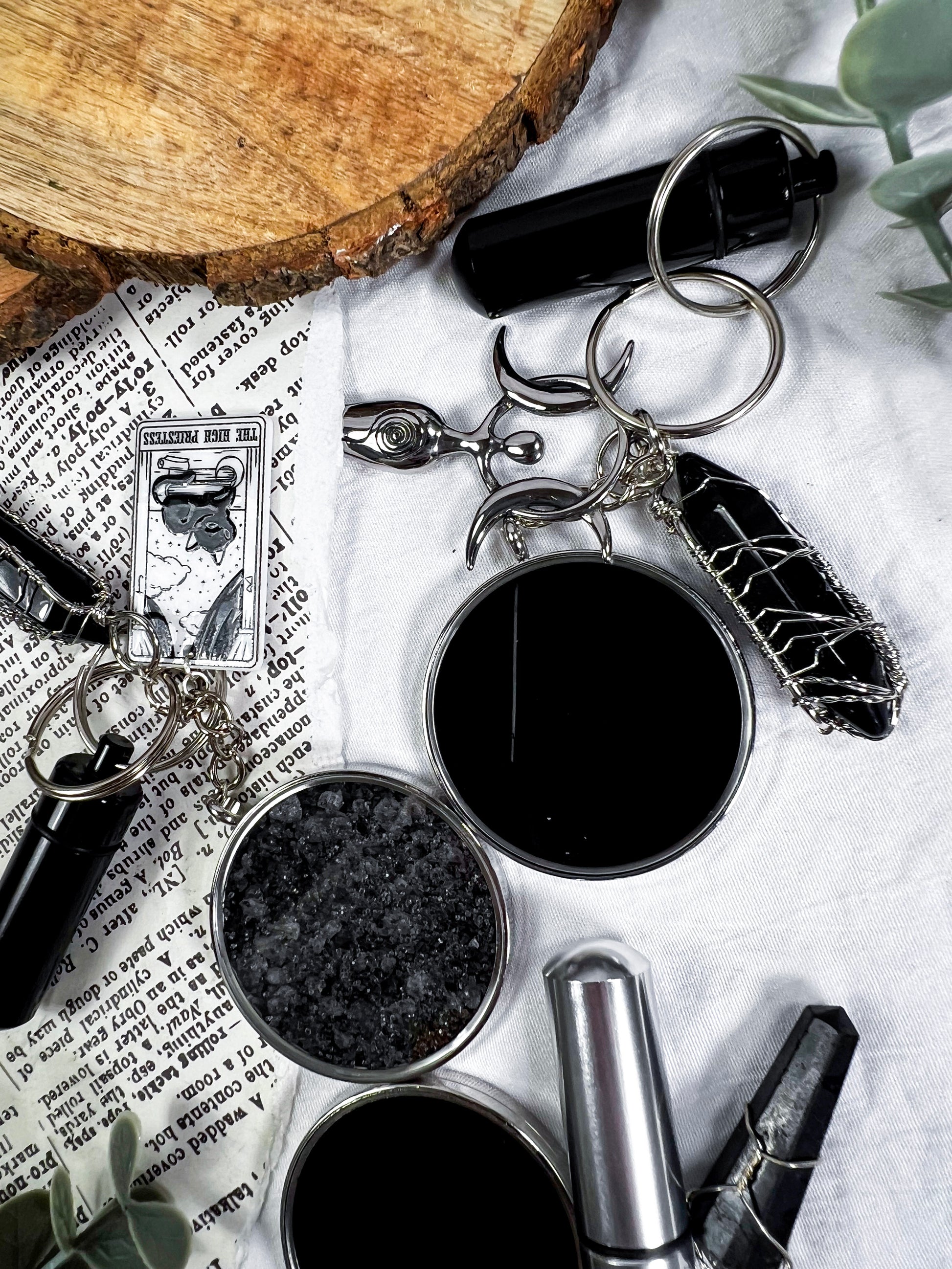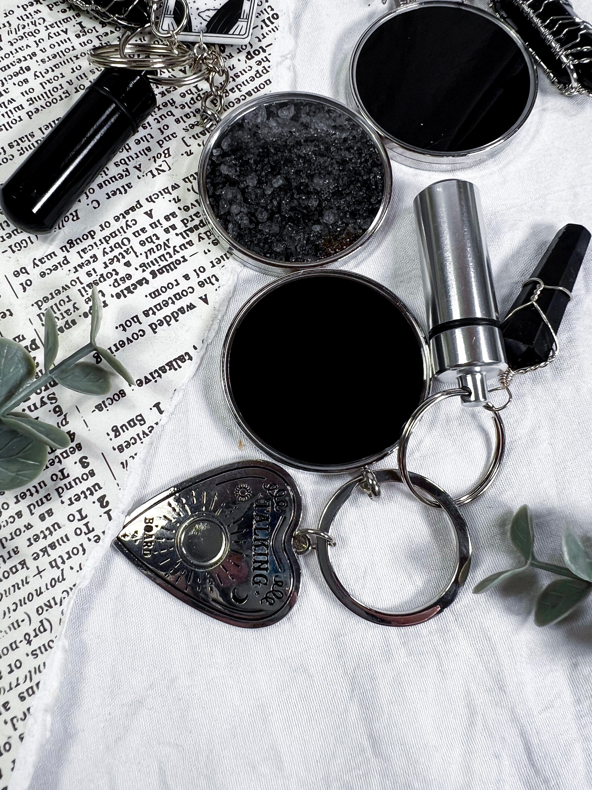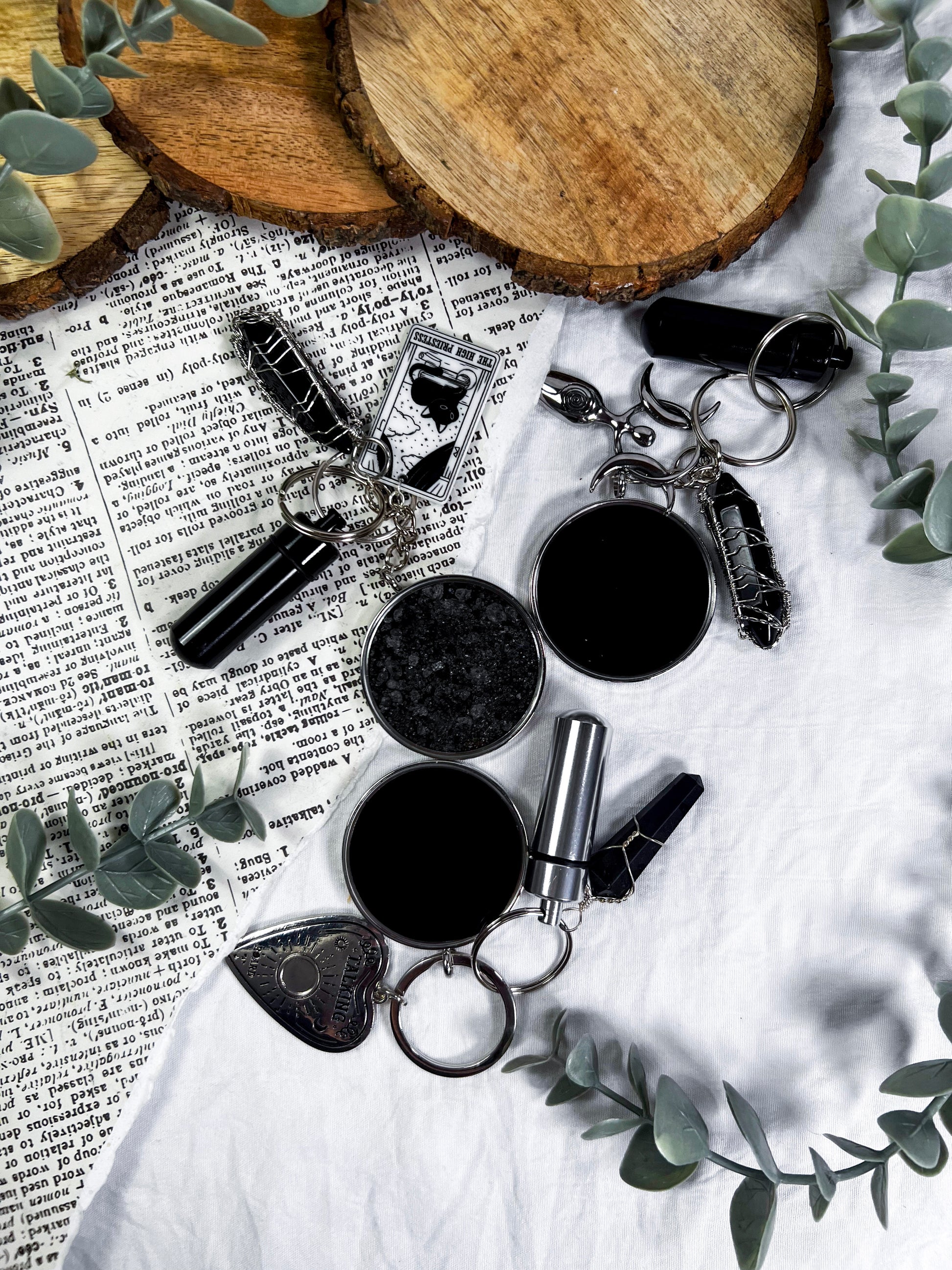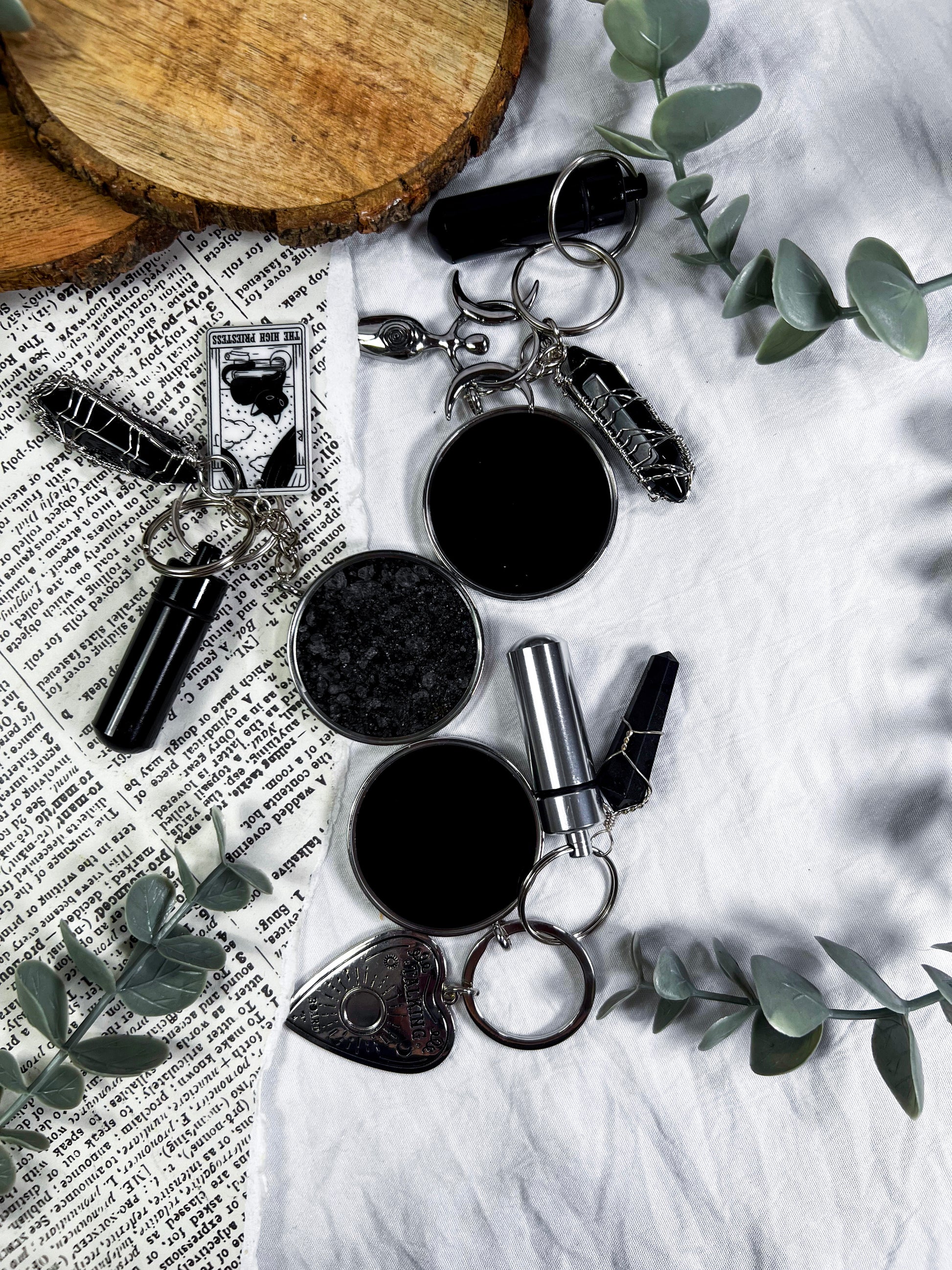 This scrying keychain is a pocket sized divination tool designed for clarity, protection, and on the go magic. Each one features a scrying locket on one side and protective black salt on the other, giving you both vision and shielding in a single piece. A randomly chosen charm adds a personal touch, while the mini spell vial and obsidian pendant deepen the energy with grounding and psychic defense. Clip it to your keys, bag, altar pouch, or planner to carry a small portal wherever you go. It is functional, witchy, protective, and perfect for quick intuitive checks throughout the day.