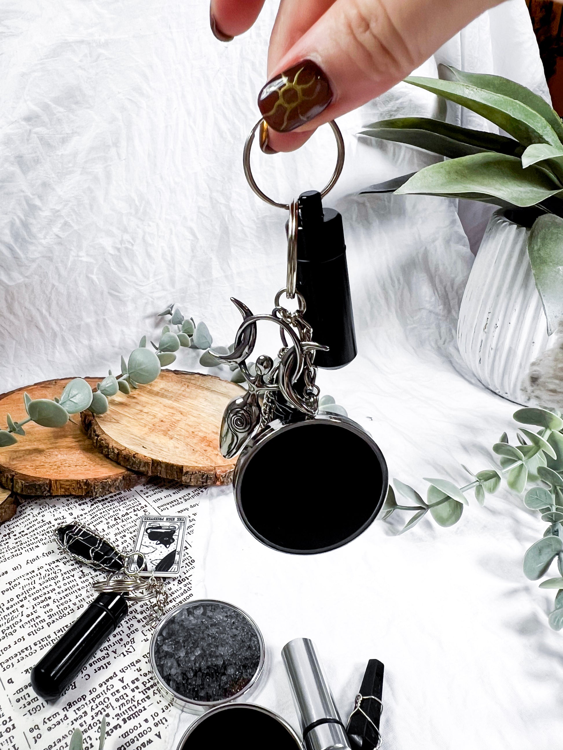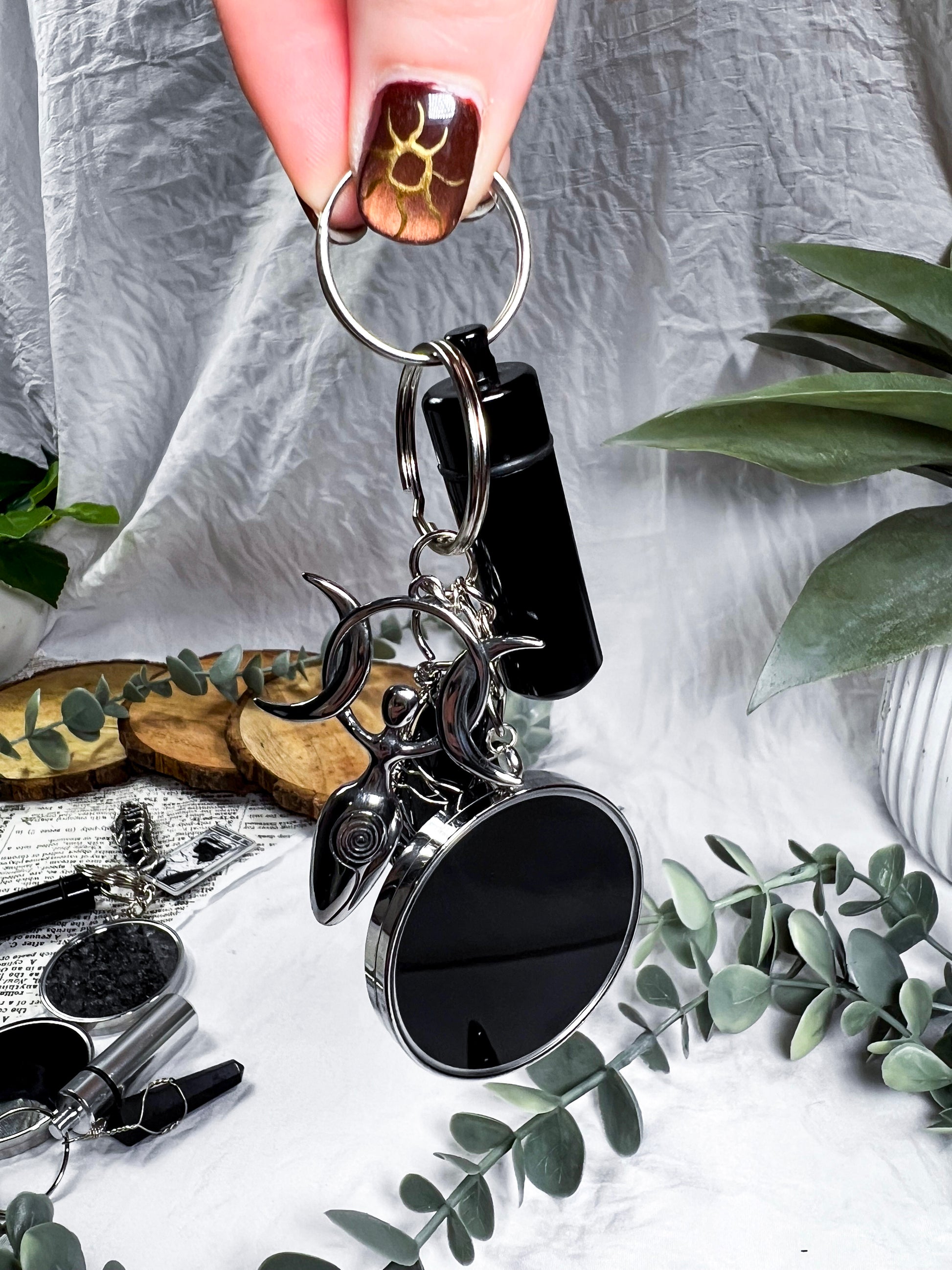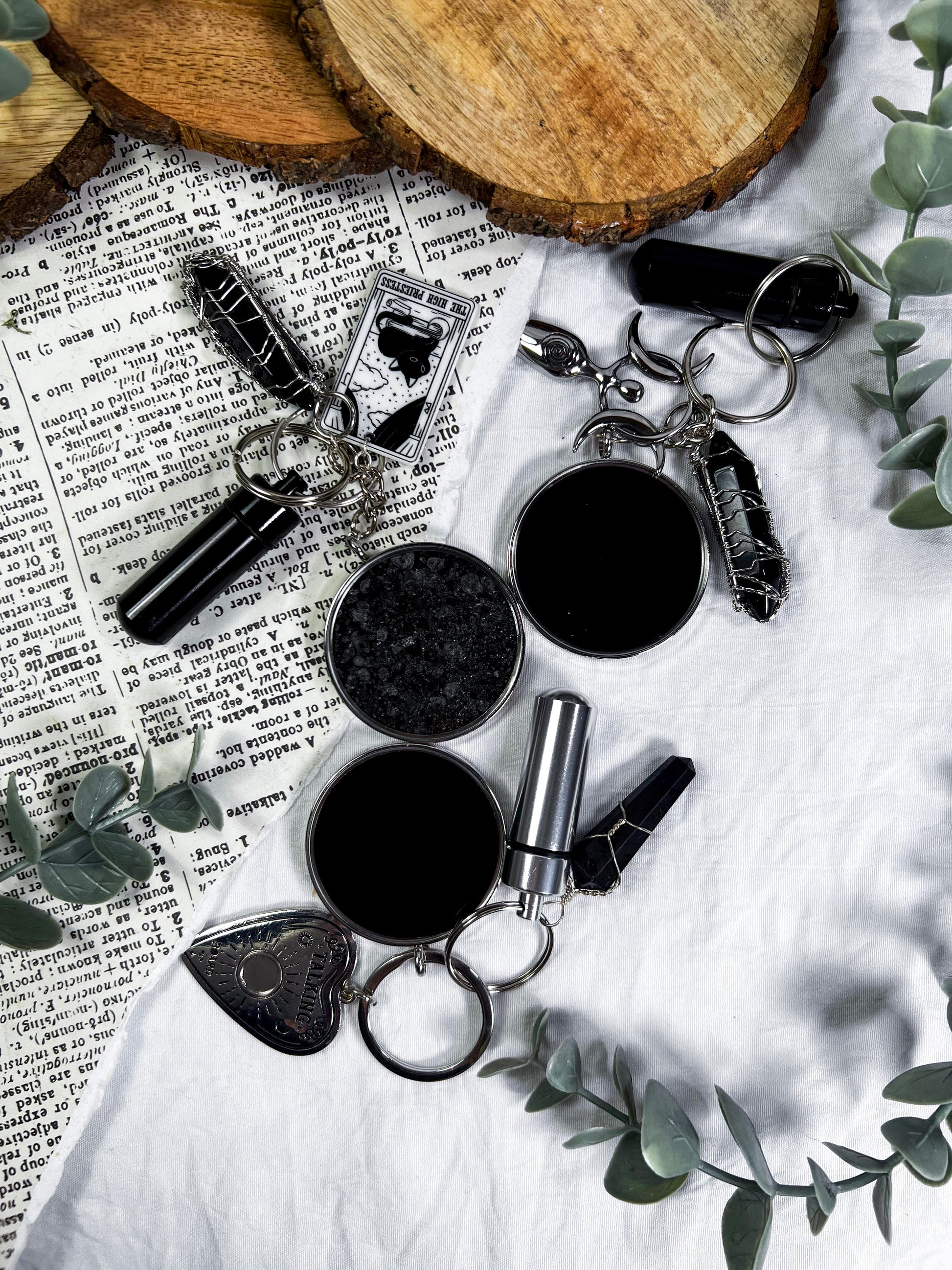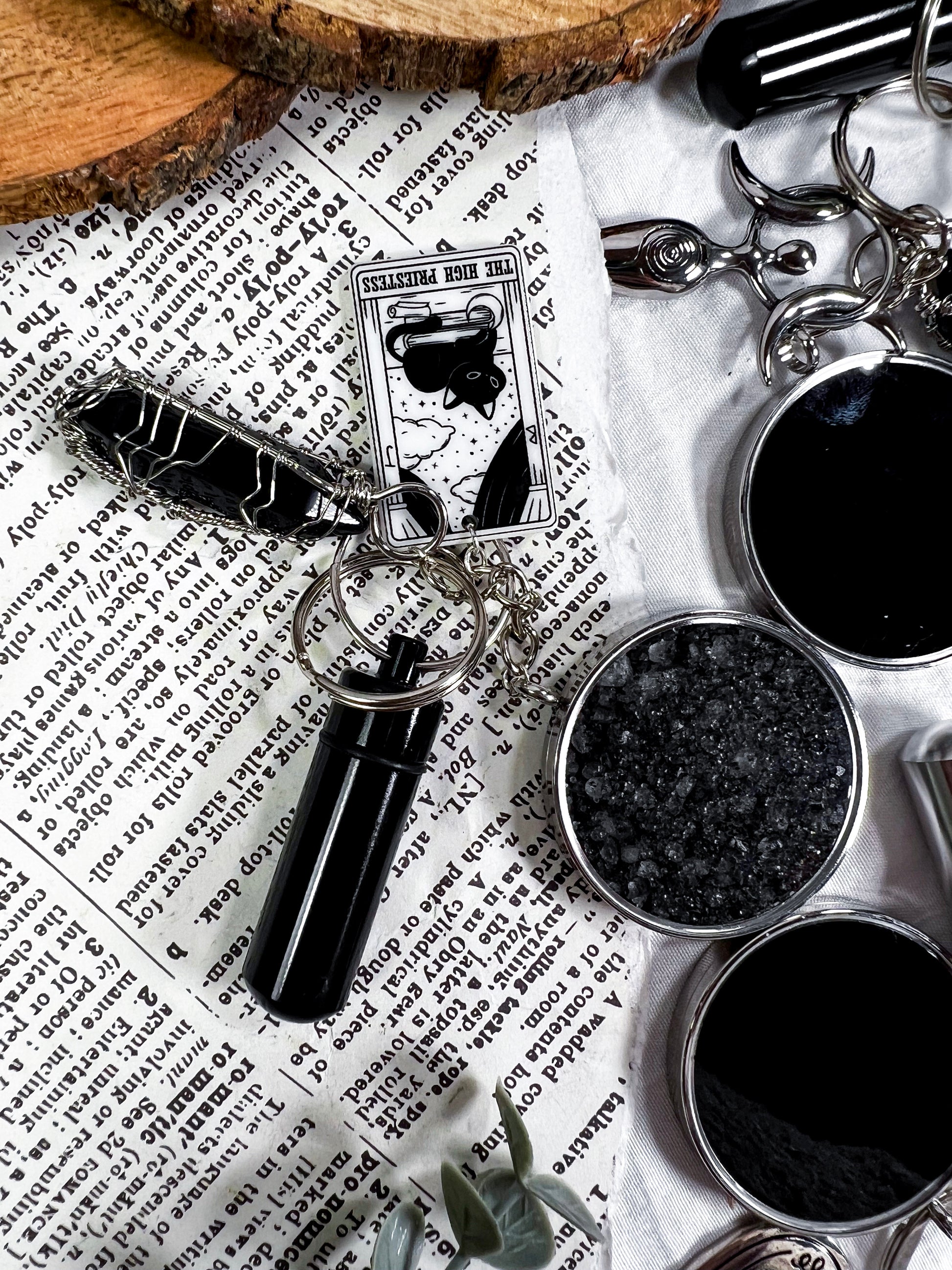 This scrying keychain is a pocket sized divination tool designed for clarity, protection, and on the go magic. Each one features a scrying locket on one side and protective black salt on the other, giving you both vision and shielding in a single piece. A randomly chosen charm adds a personal touch, while the mini spell vial and obsidian pendant deepen the energy with grounding and psychic defense. Clip it to your keys, bag, altar pouch, or planner to carry a small portal wherever you go. It is functional, witchy, protective, and perfect for quick intuitive checks throughout the day.