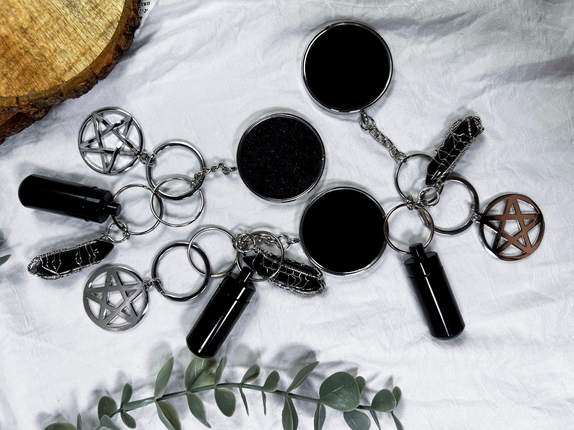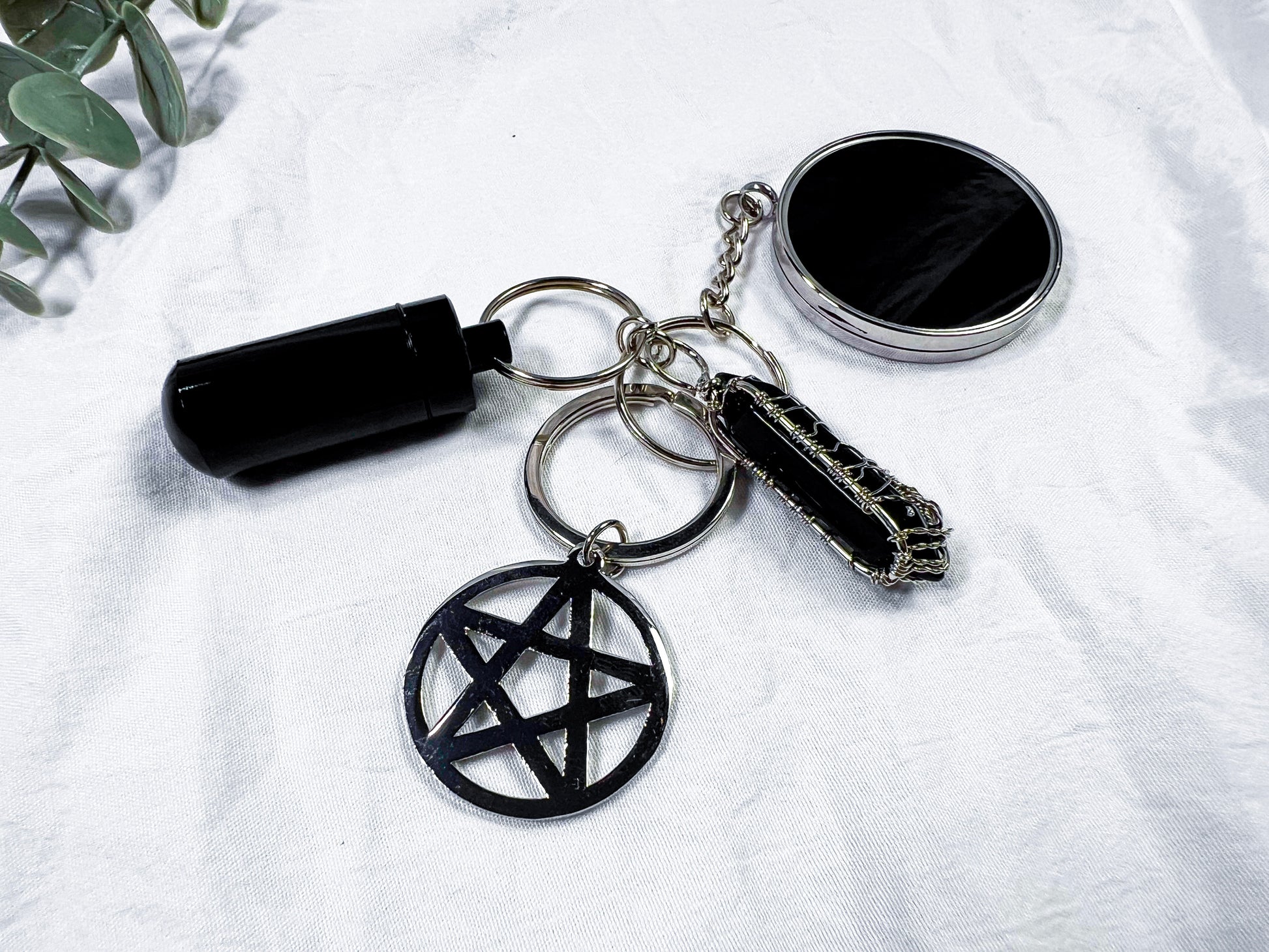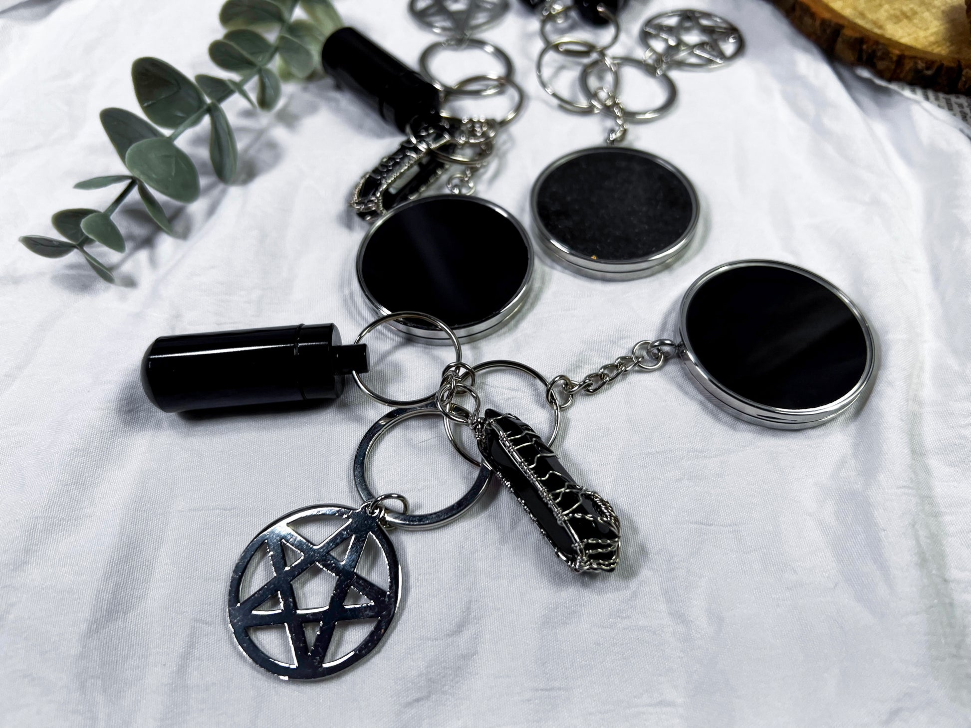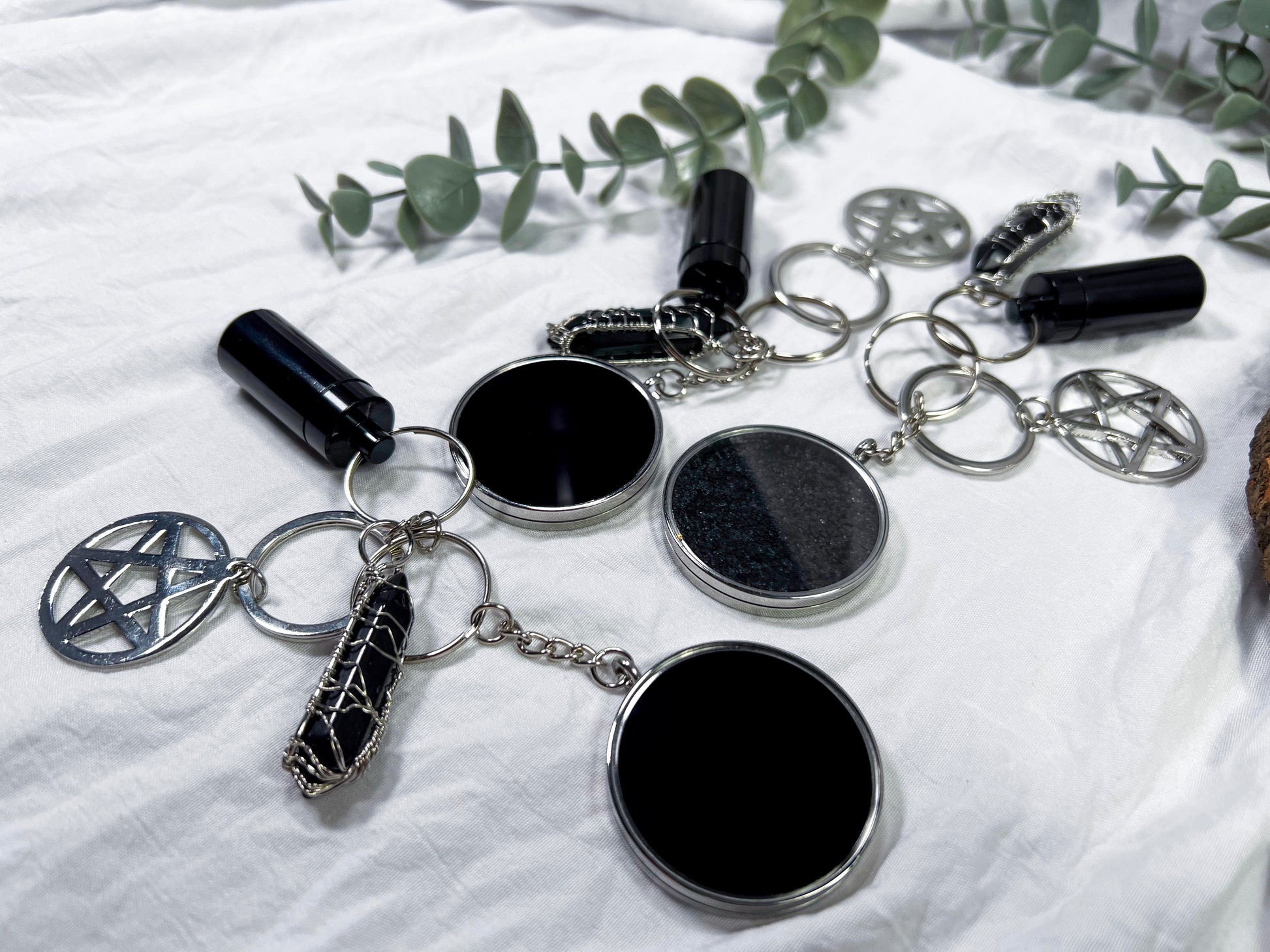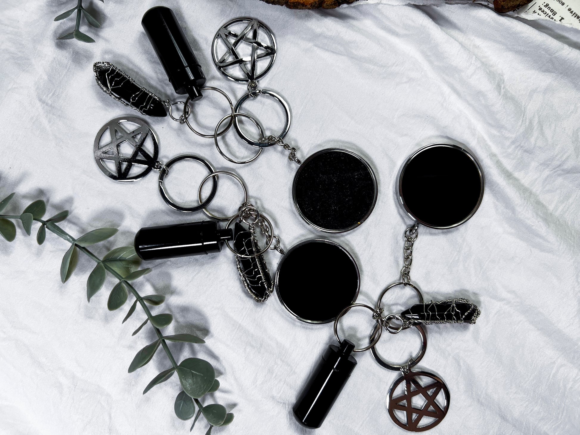 scrying mirror keychain, obsidian crystal charm, pentacle talisman witchcraft, black salt protection vial, portable divination tool, samhain shadow work, psychic protection charm, occult witch keychain, spiritual defense amulet, ancestor veil work