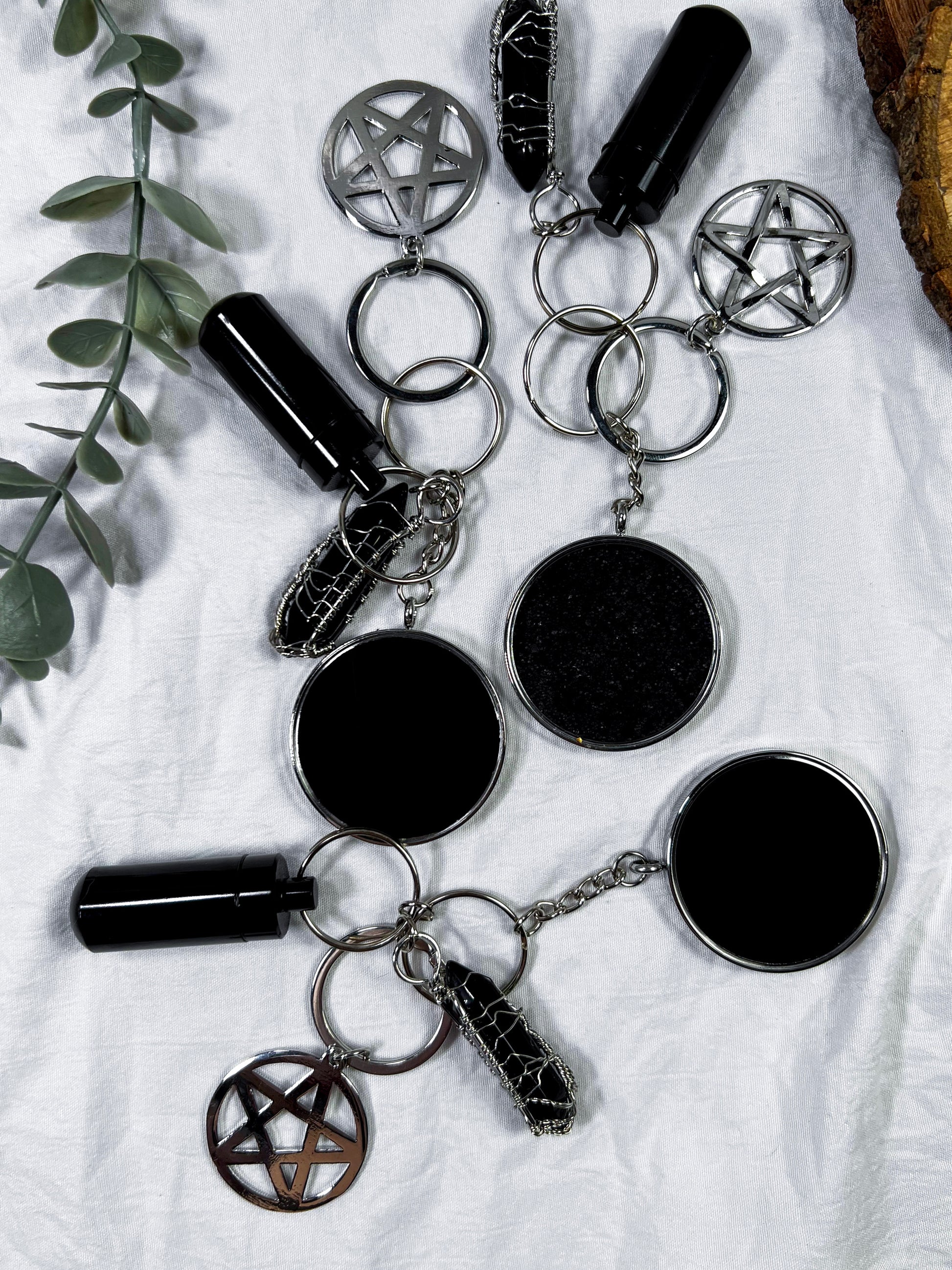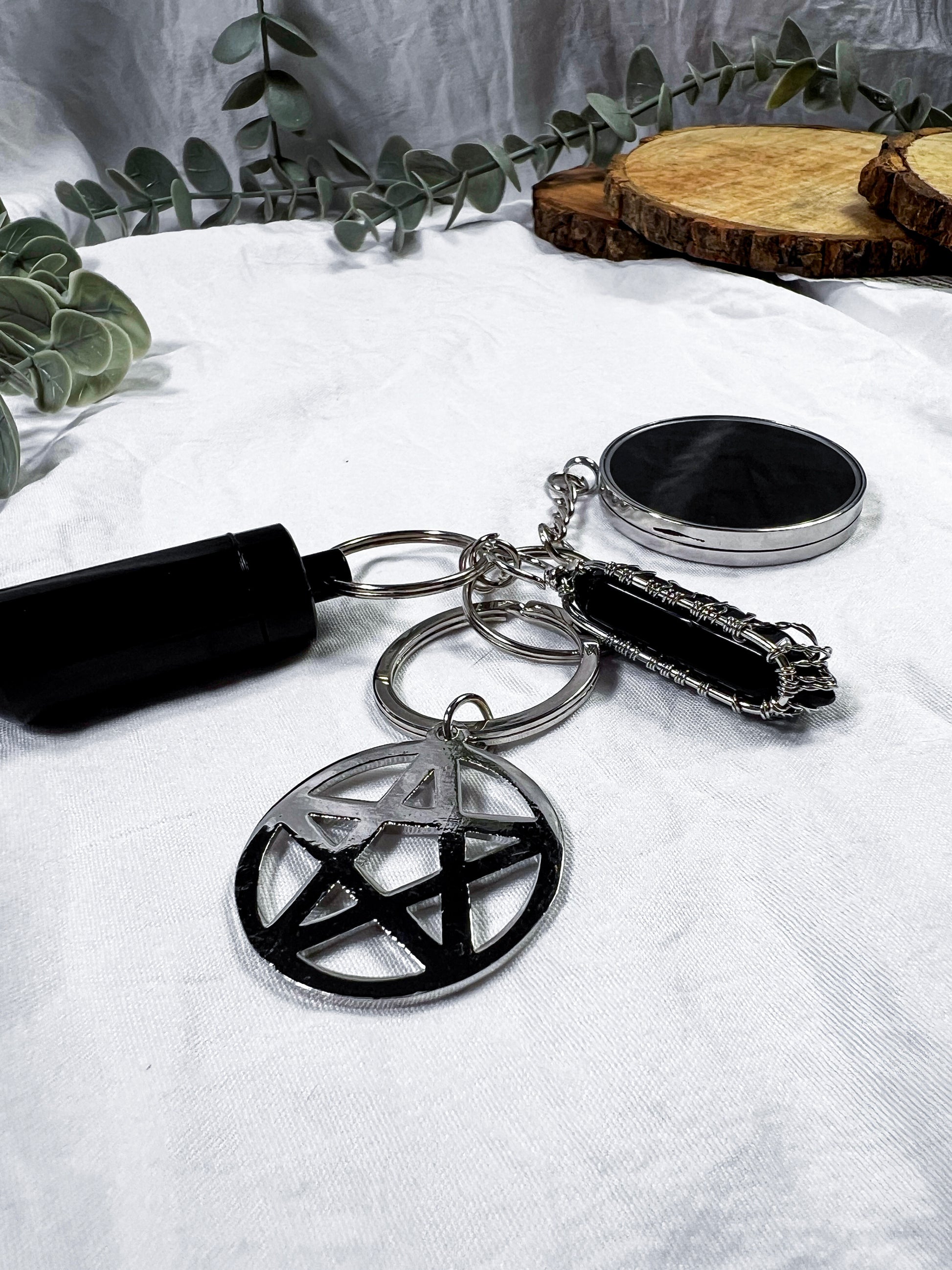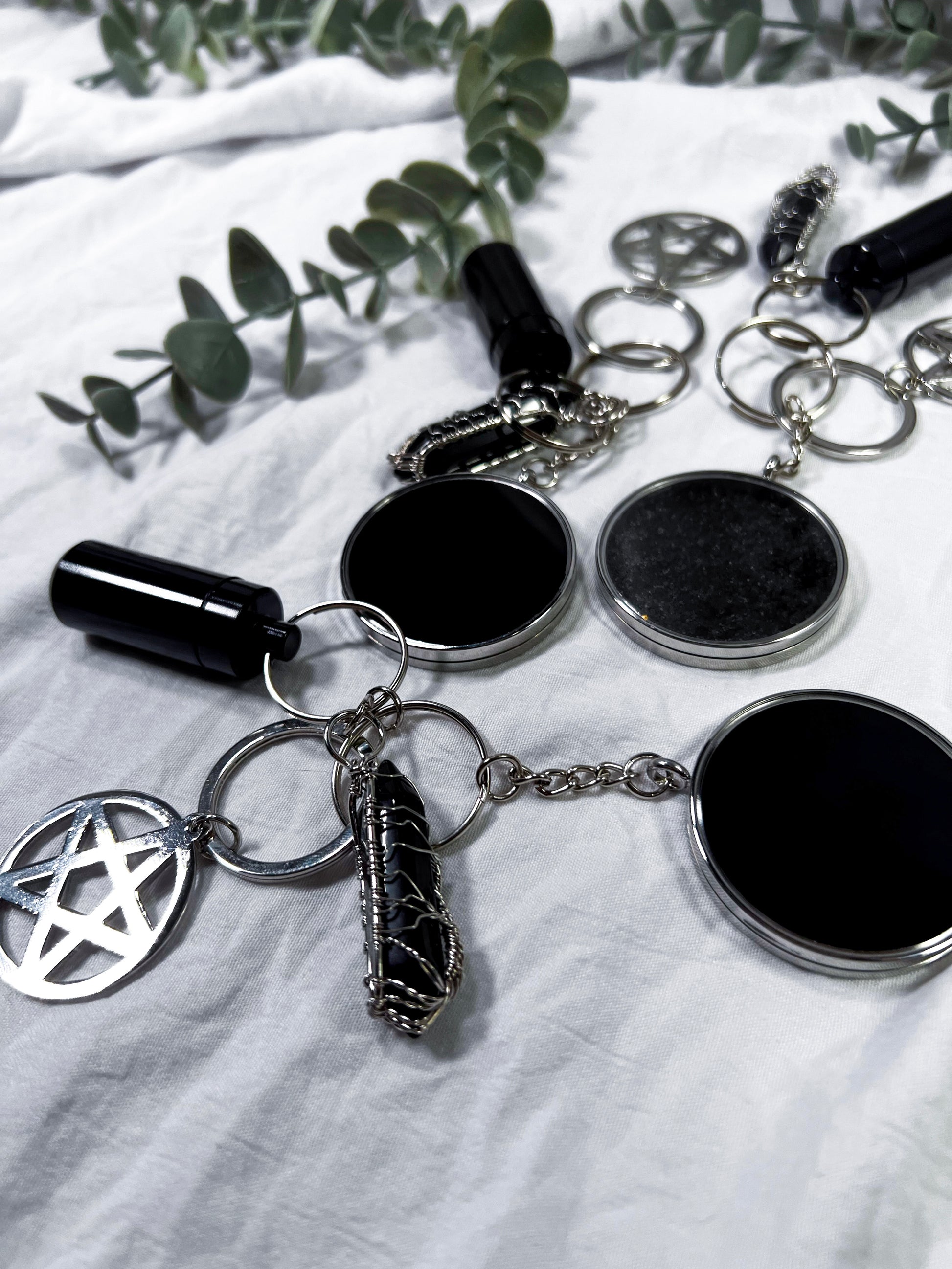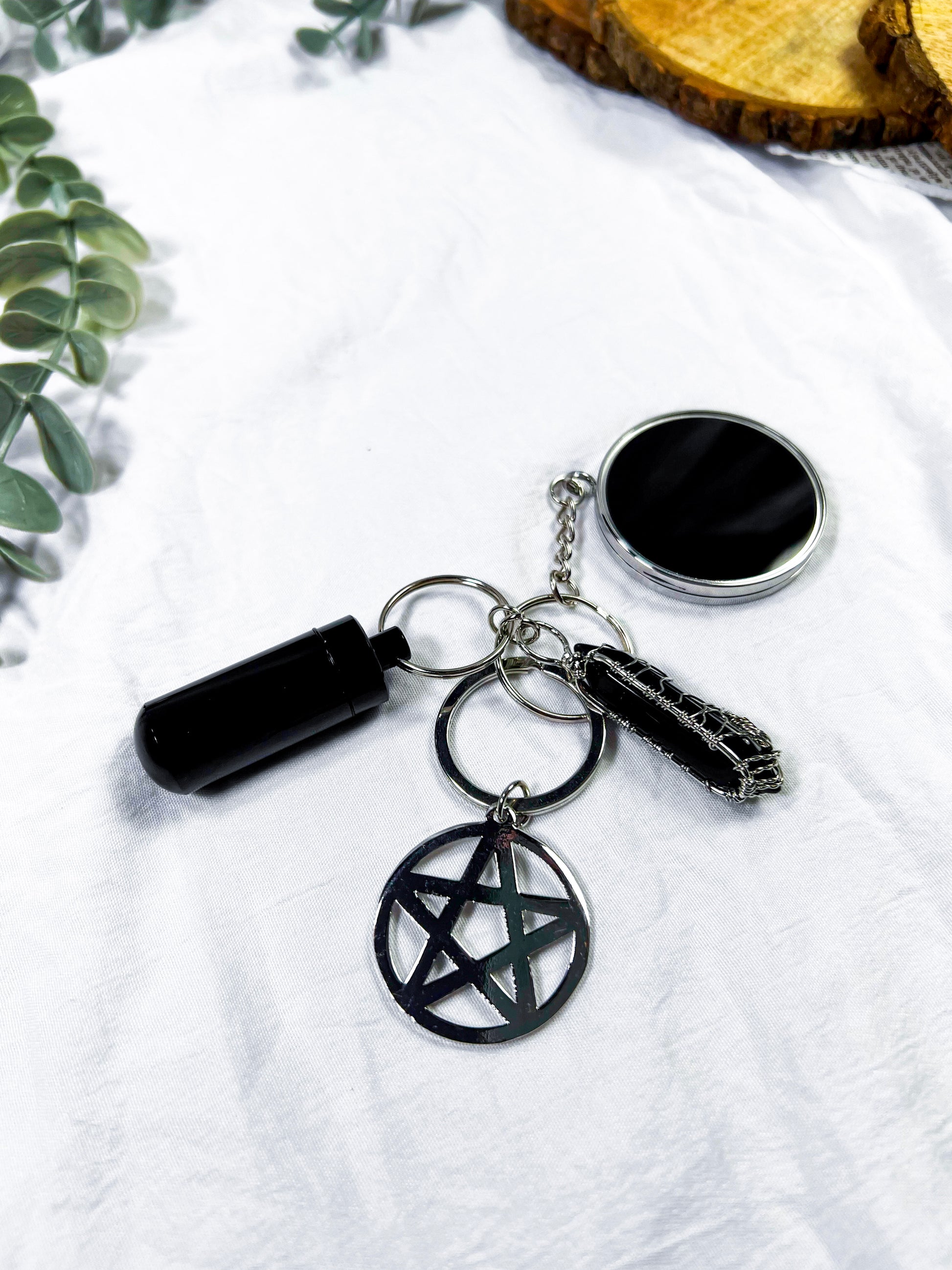 scrying mirror keychain, obsidian crystal charm, pentacle talisman witchcraft, black salt protection vial, portable divination tool, samhain shadow work, psychic protection charm, occult witch keychain, spiritual defense amulet, ancestor veil work