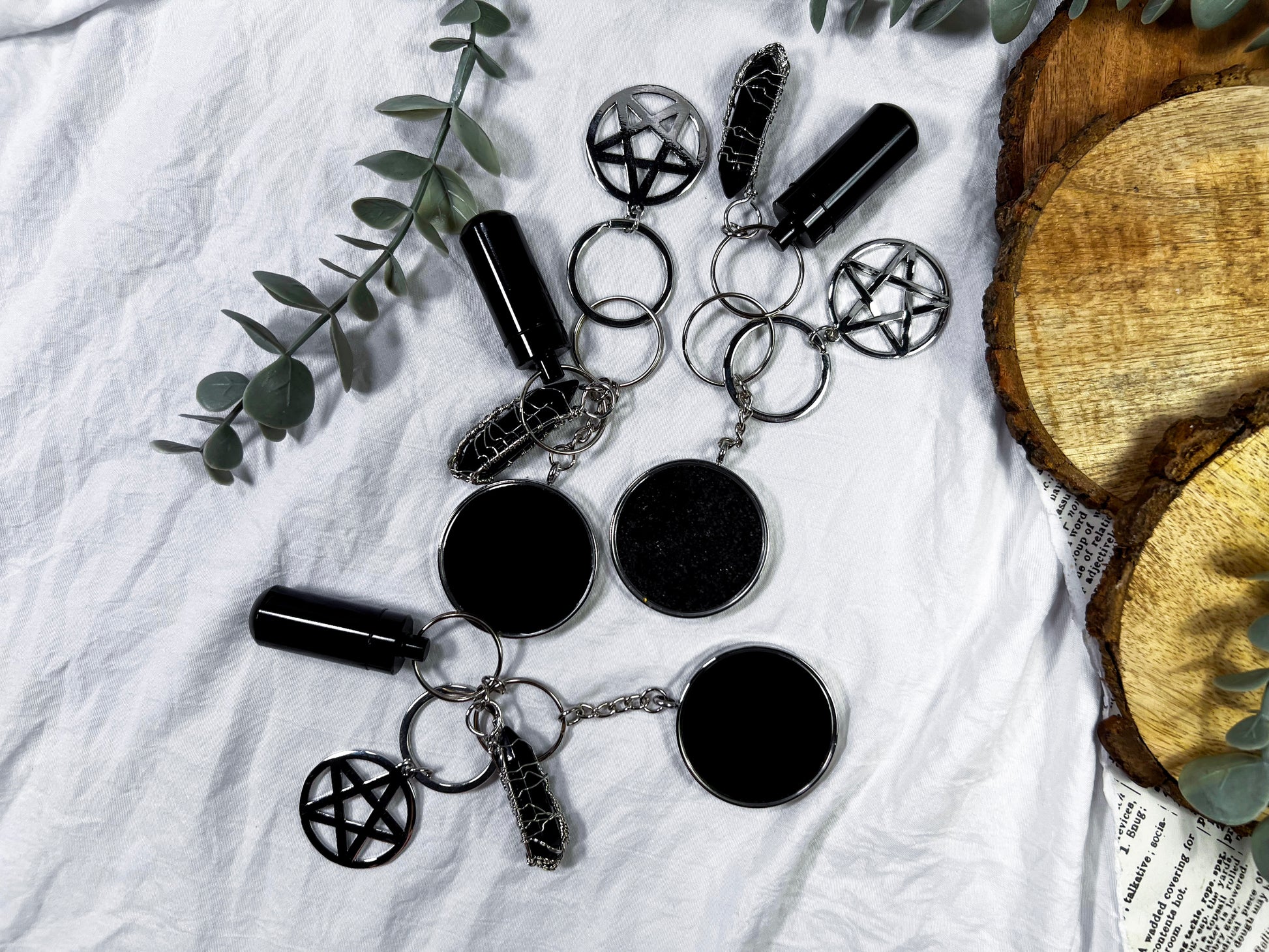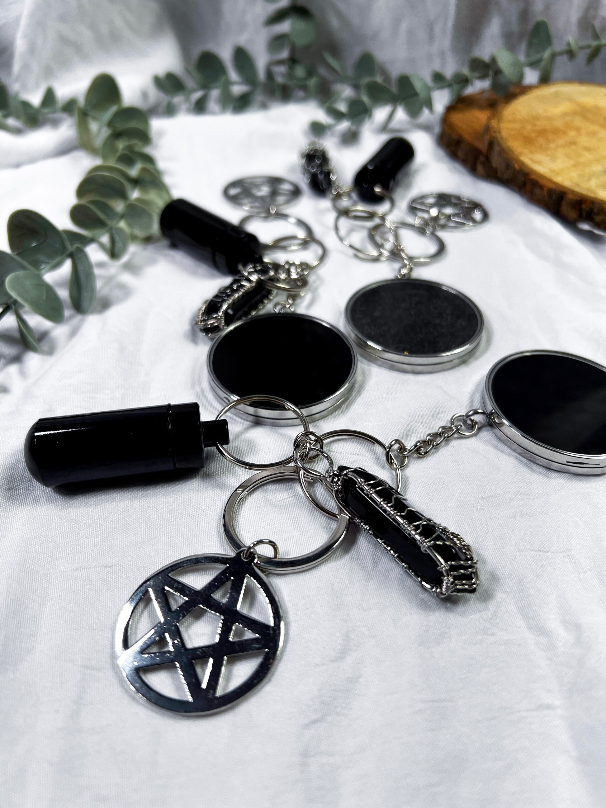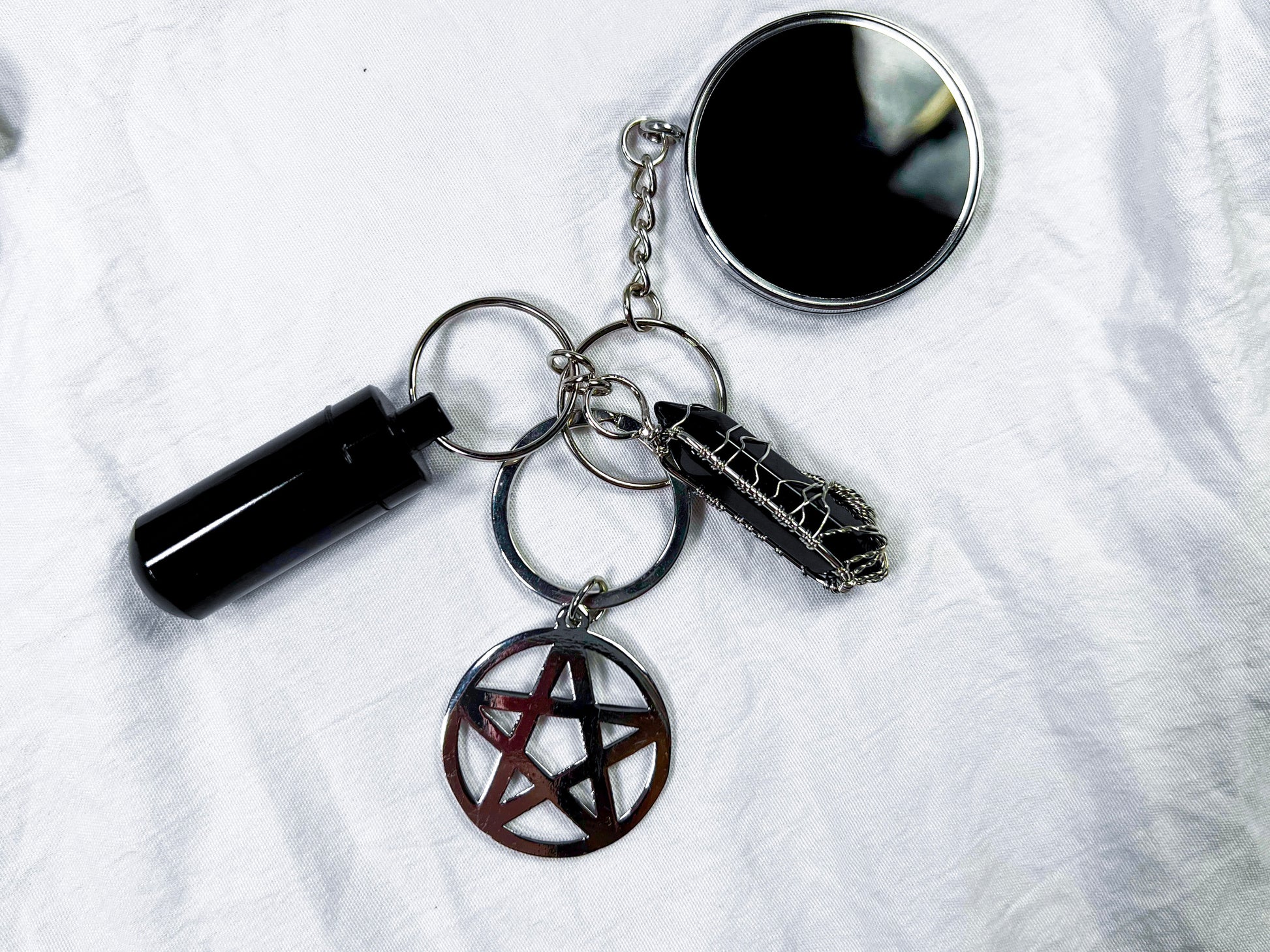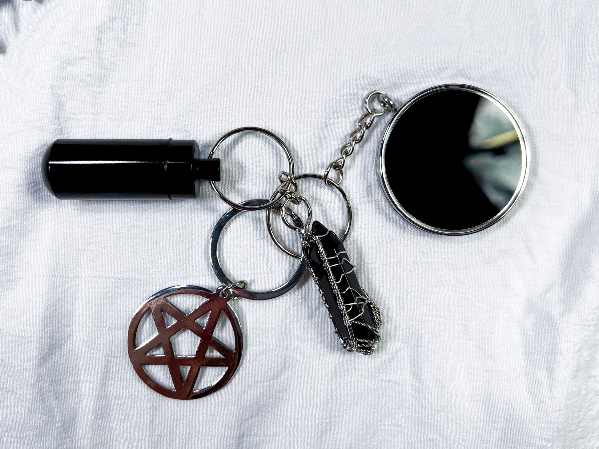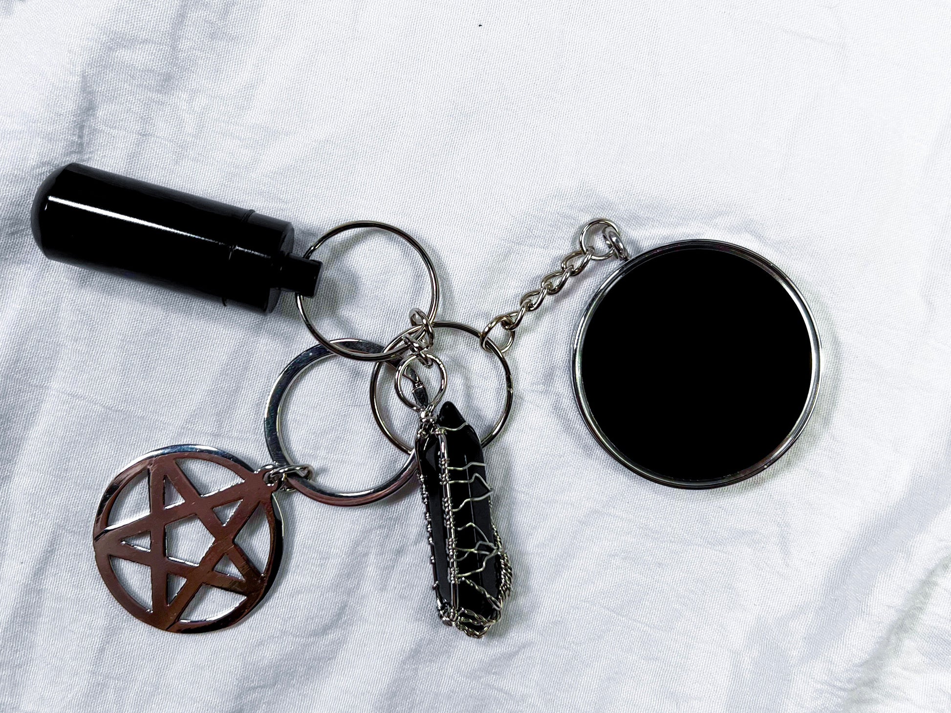 scrying mirror keychain, obsidian crystal charm, pentacle talisman witchcraft, black salt protection vial, portable divination tool, samhain shadow work, psychic protection charm, occult witch keychain, spiritual defense amulet, ancestor veil work