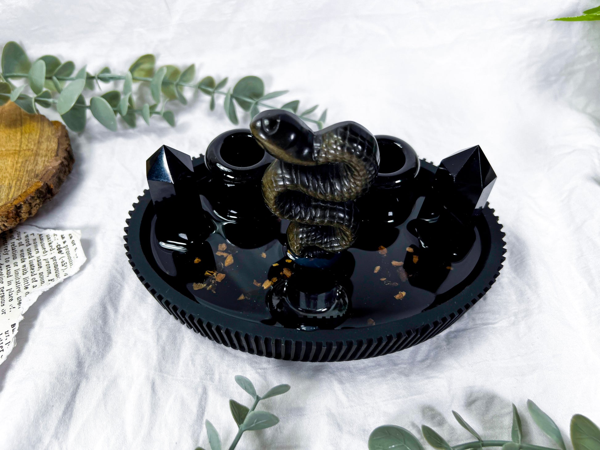 Handcrafted resin ritual base infused with angelica and centered around protective obsidian elements, designed to support grounding, protection, and deep energetic work. The serpent symbol and dark stone pairing create a strong, intentional setup ideal for protective rituals, shadow work, or anchoring your sacred space.