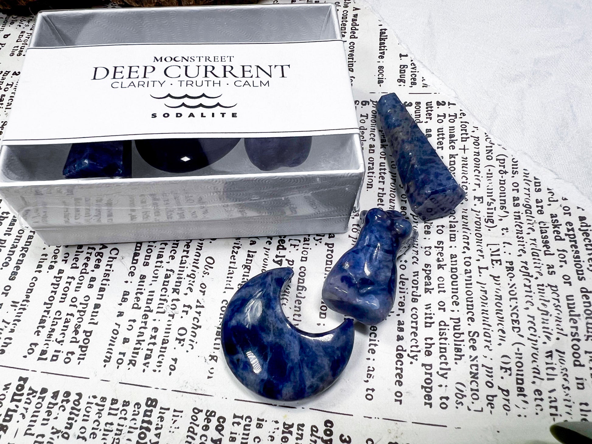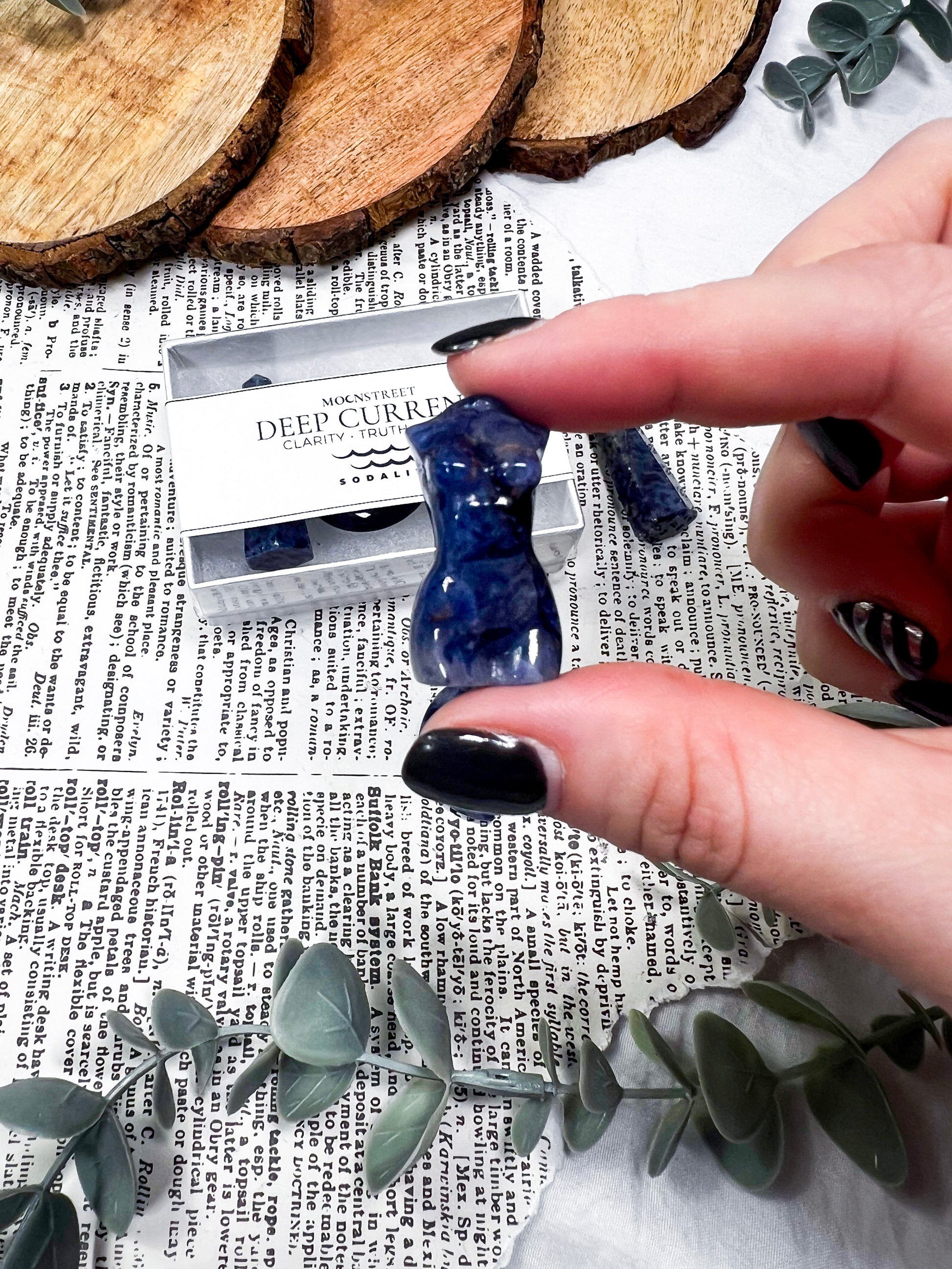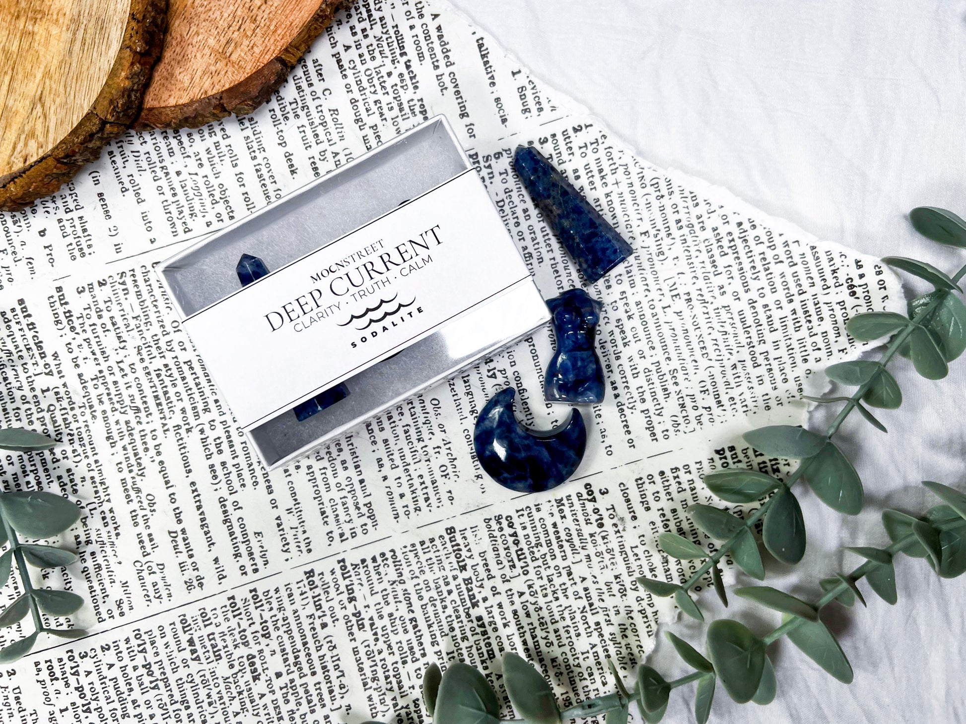 The Sodalite Mini Set clears confusion and deepens insight. Each box includes a sodalite goddess carving, tower, and moon, all which are symbols of clarity, intuition, and wisdom.
