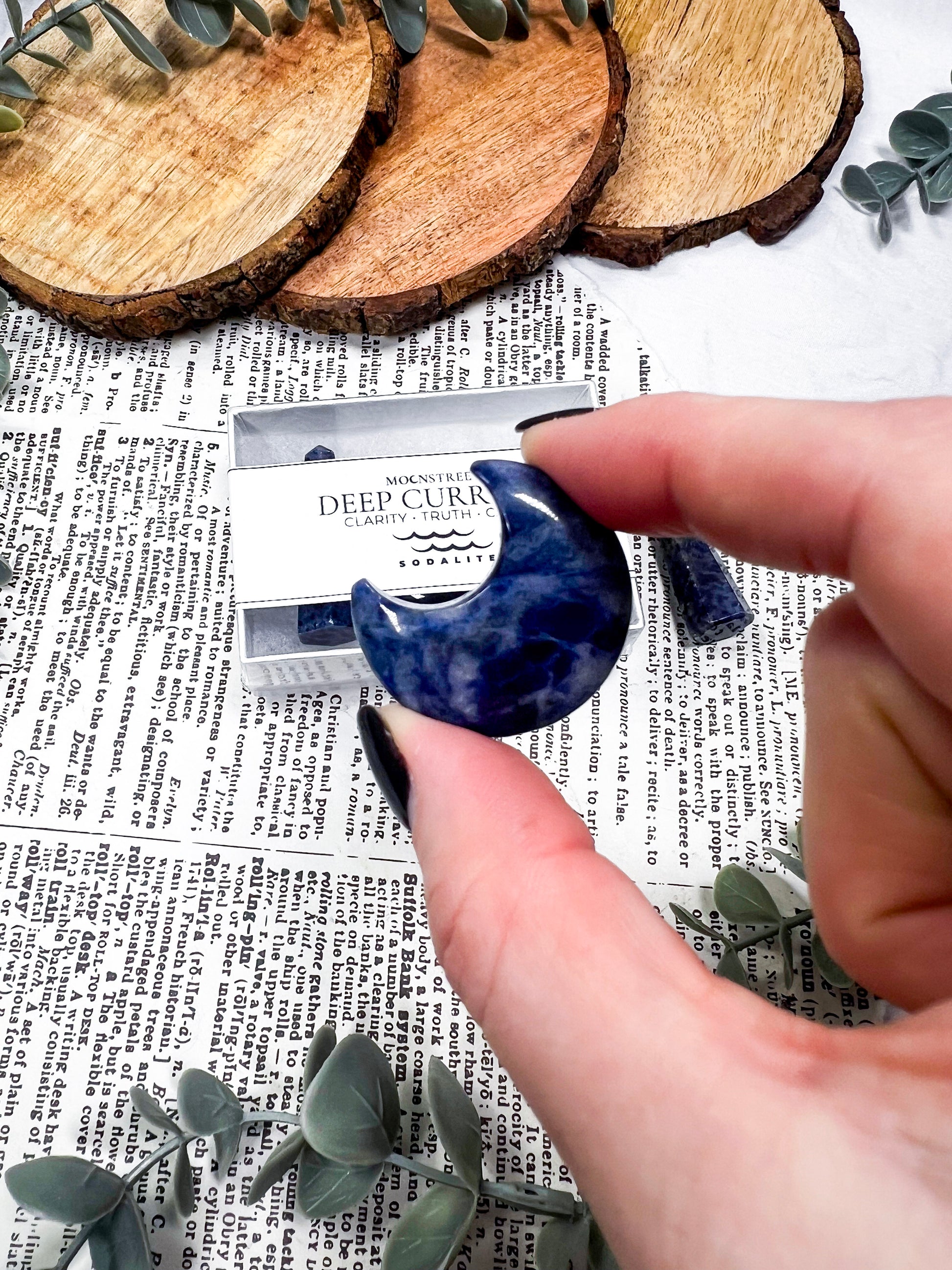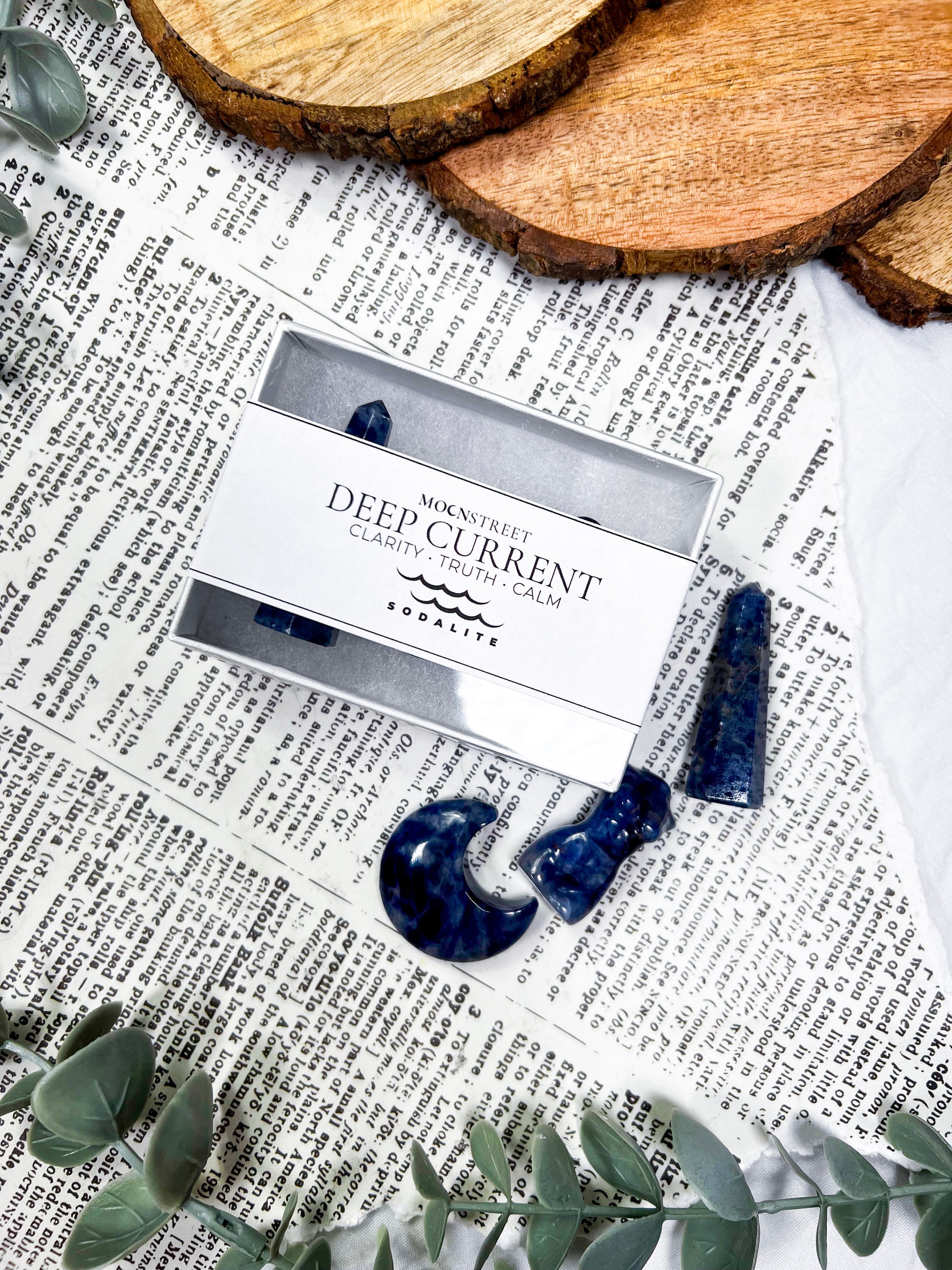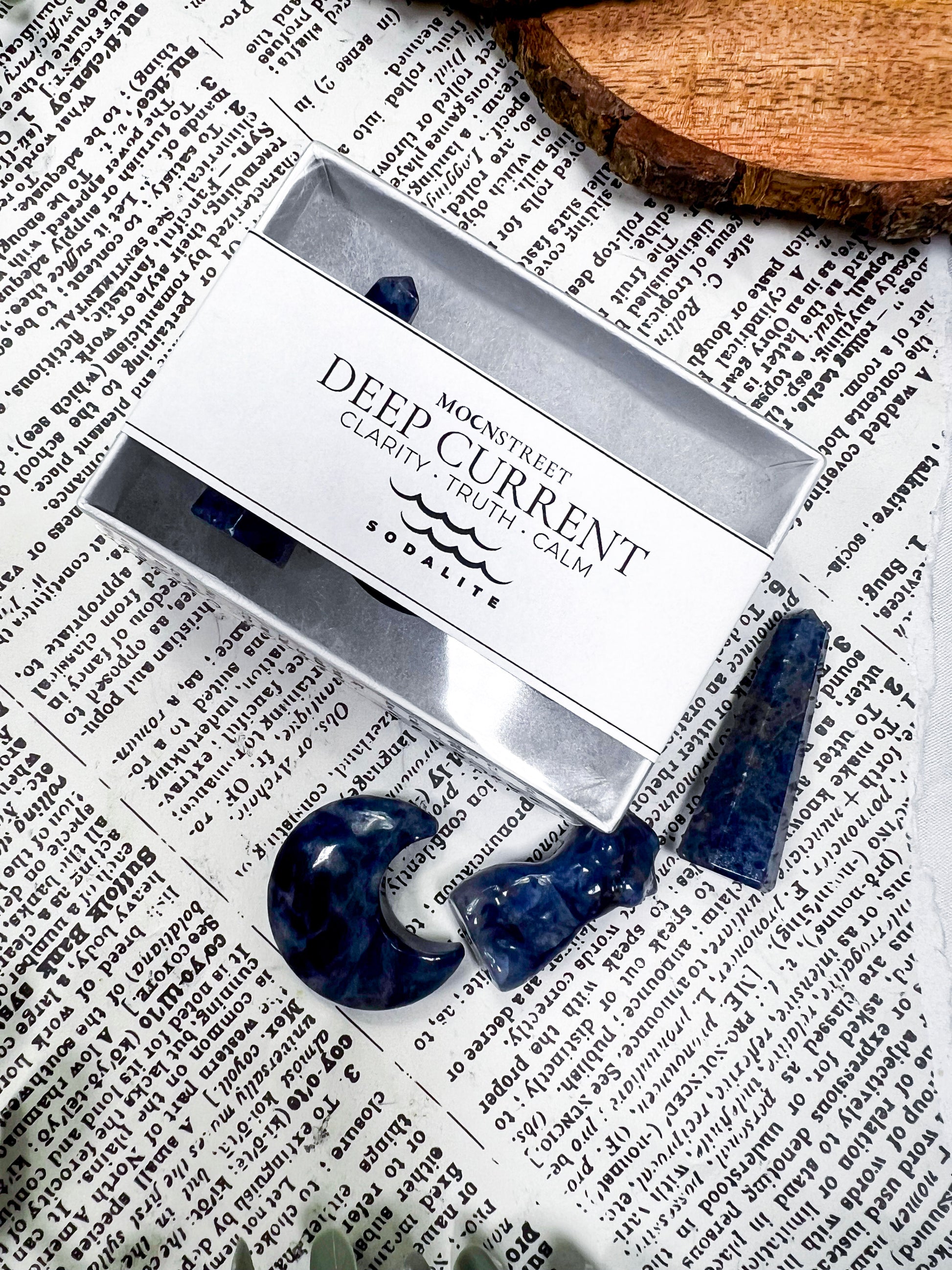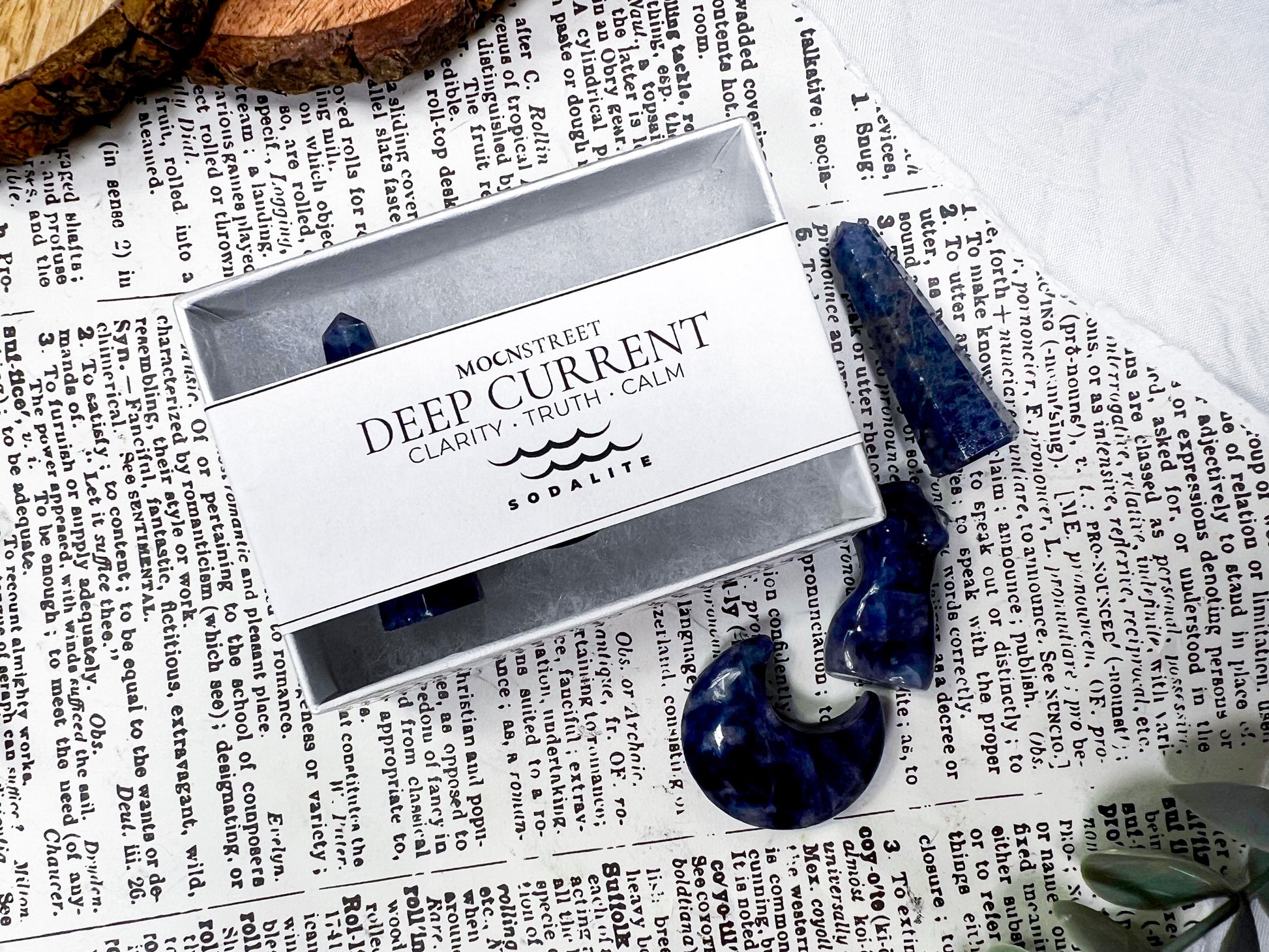 The Sodalite Mini Set clears confusion and deepens insight. Each box includes a sodalite goddess carving, tower, and moon, all which are symbols of clarity, intuition, and wisdom.