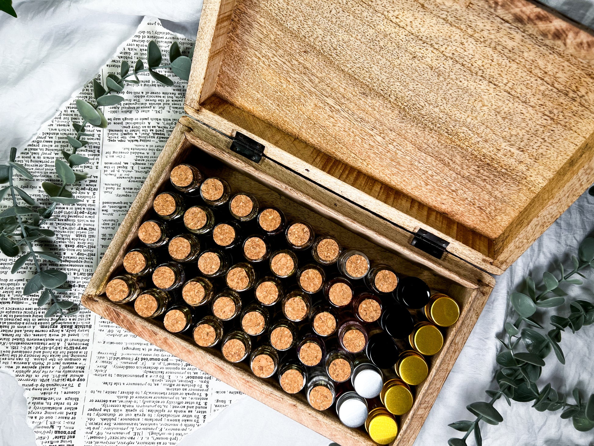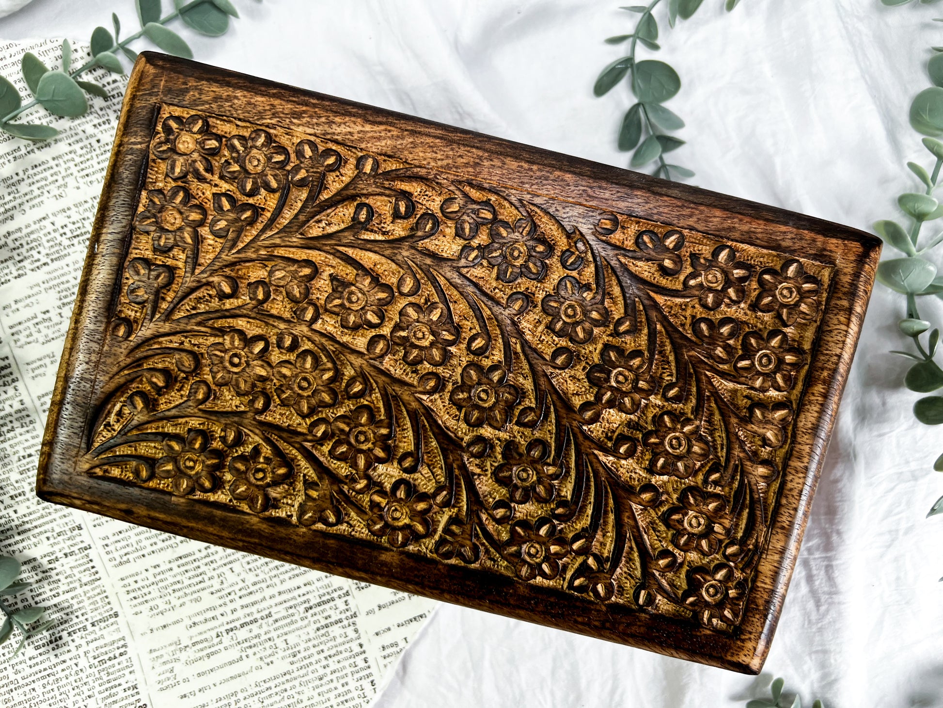 This floral engraved wooden box is a full witchcraft starter, study, and mastery kit packed with everything you need to build spells, blends, offerings, and altar work. Inside the 10 by 6 inch box you’ll receive 30 different herbs, 10 crystal chips, Florida Water and Rose Water, three intuitively chosen oils, five ritual salts, and a set of 10ml bottles for mixing, blending, or building your own creations.
