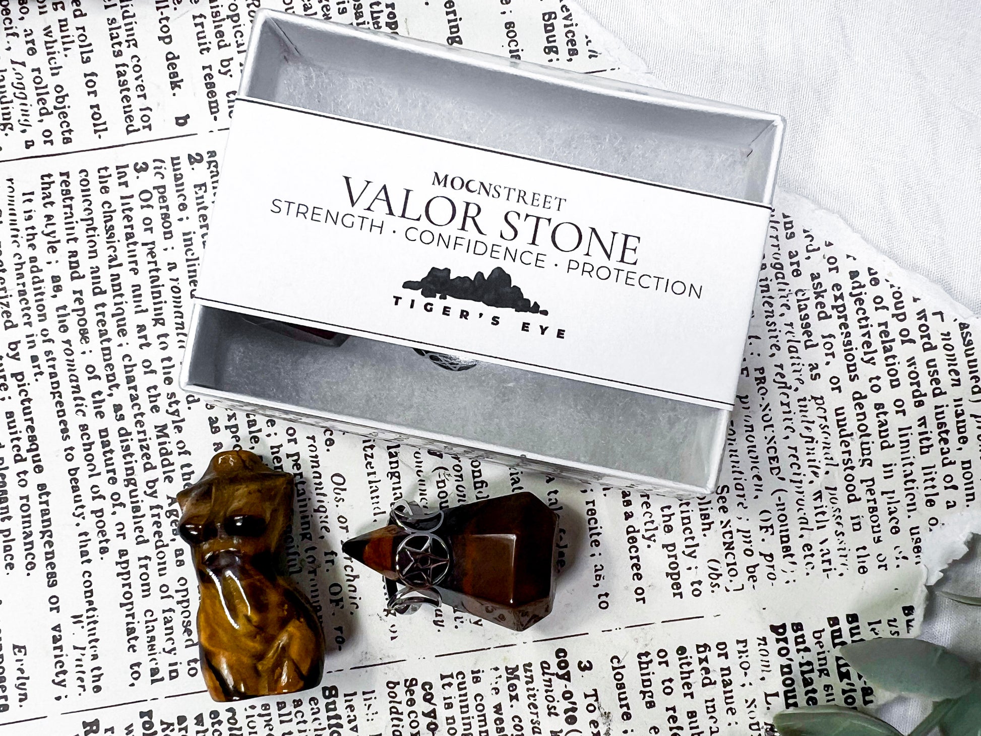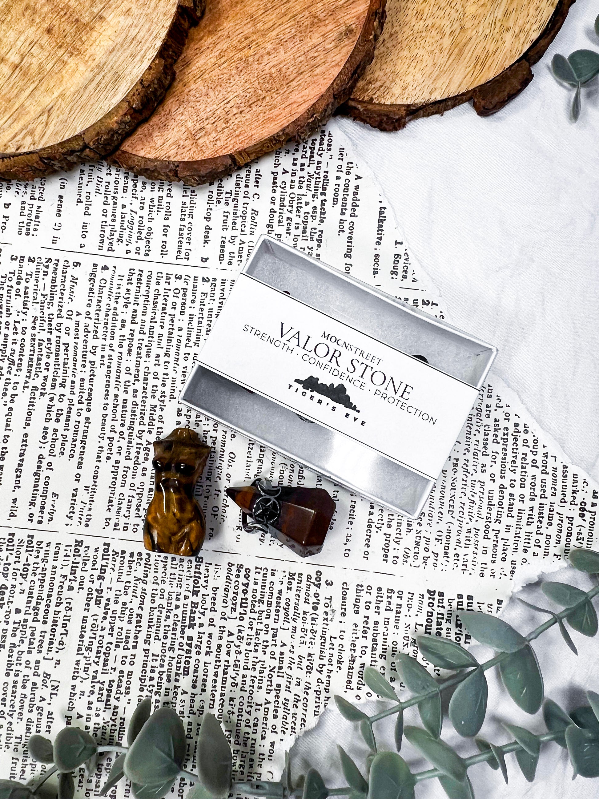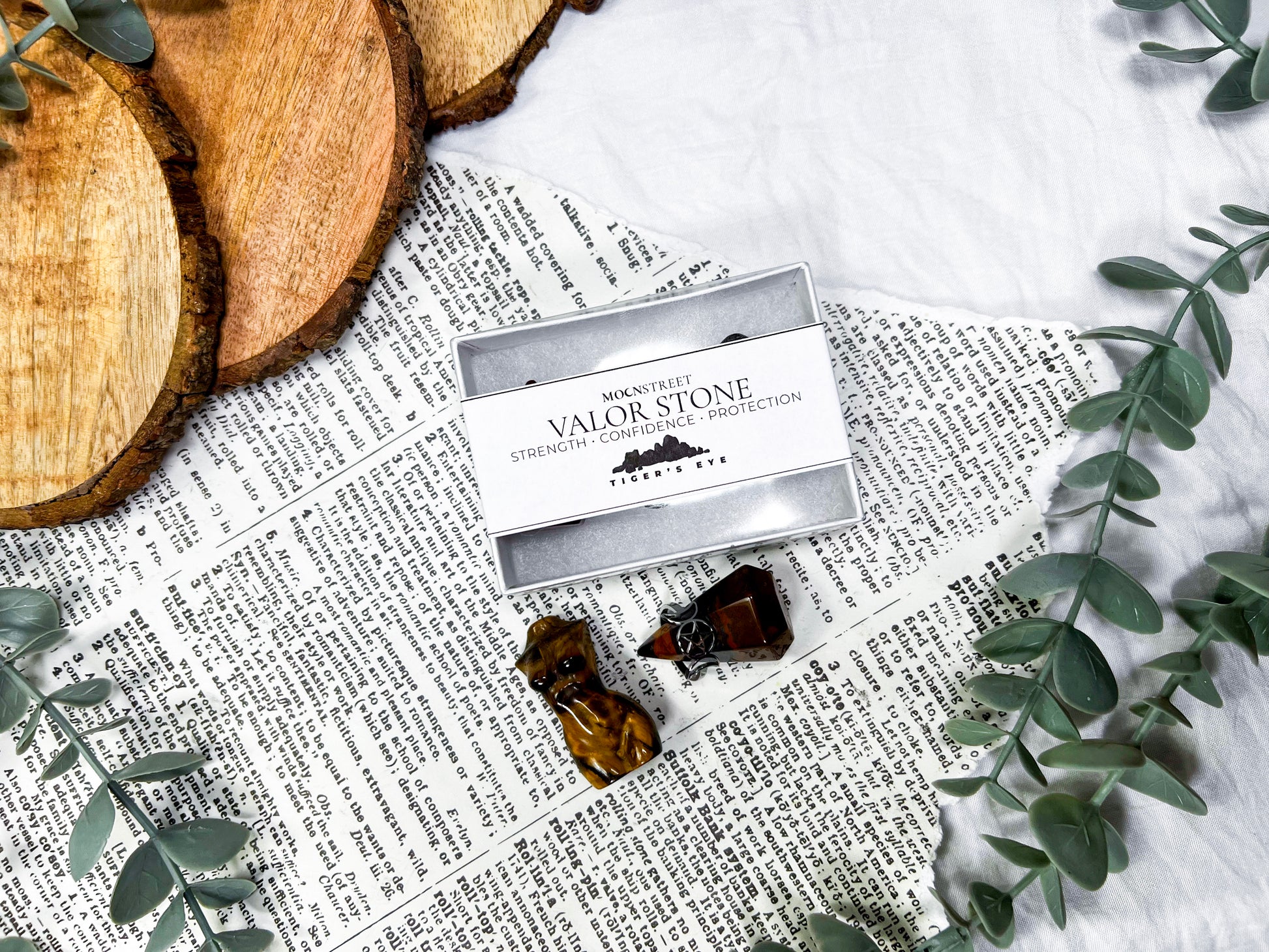 The Tiger’s Eye Mini Set embodies strength, protection, and courage. Includes a tiger’s eye goddess carving, matching ring holder, and a silver adjustable triple moon ring.