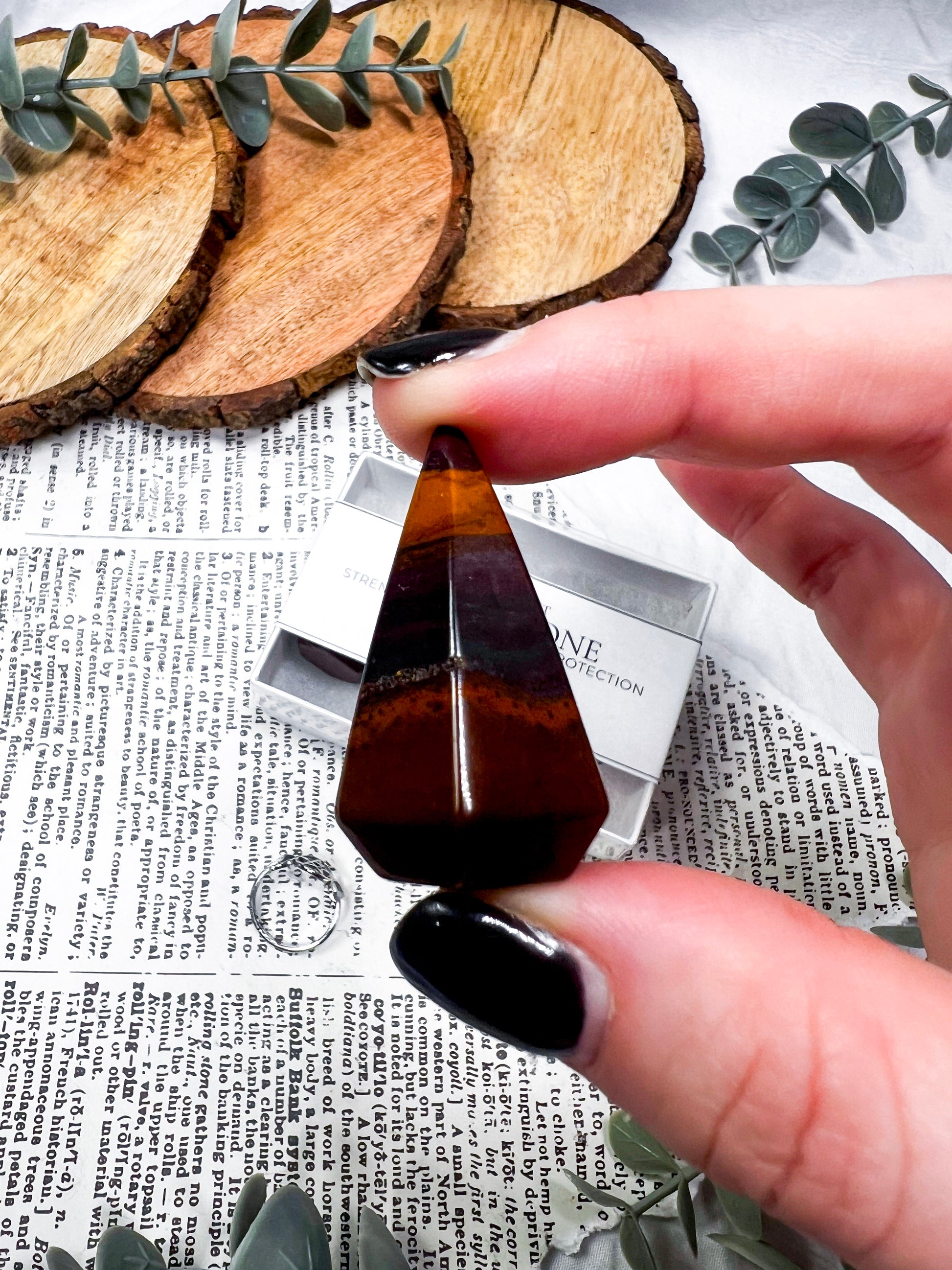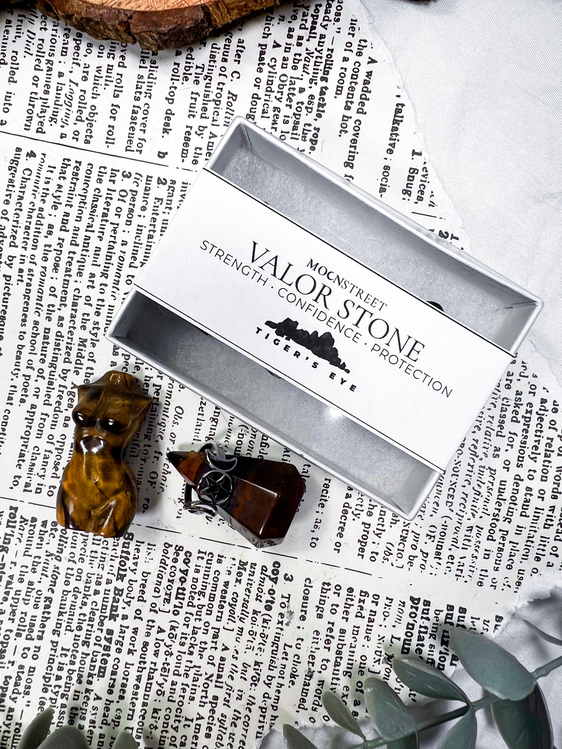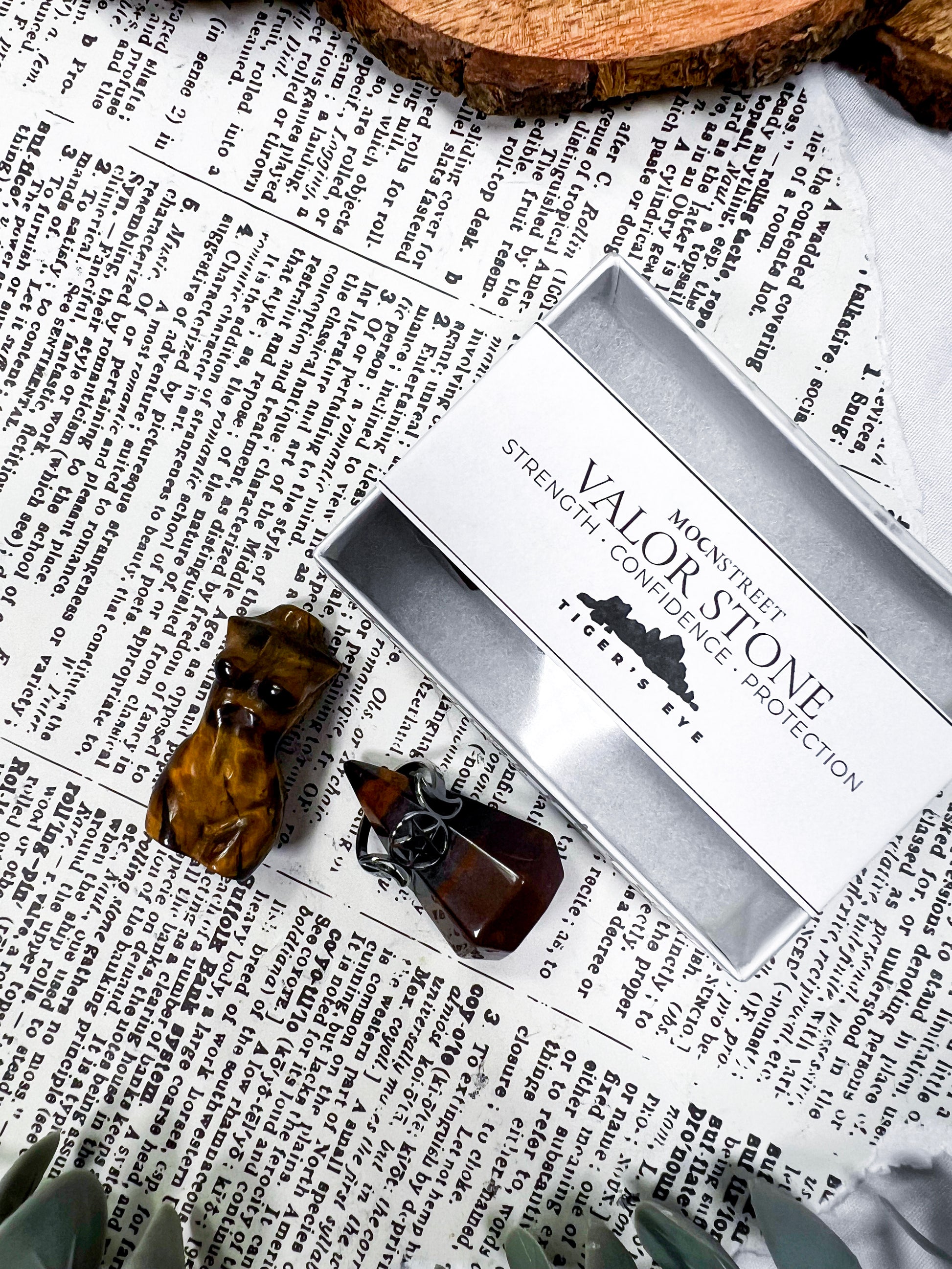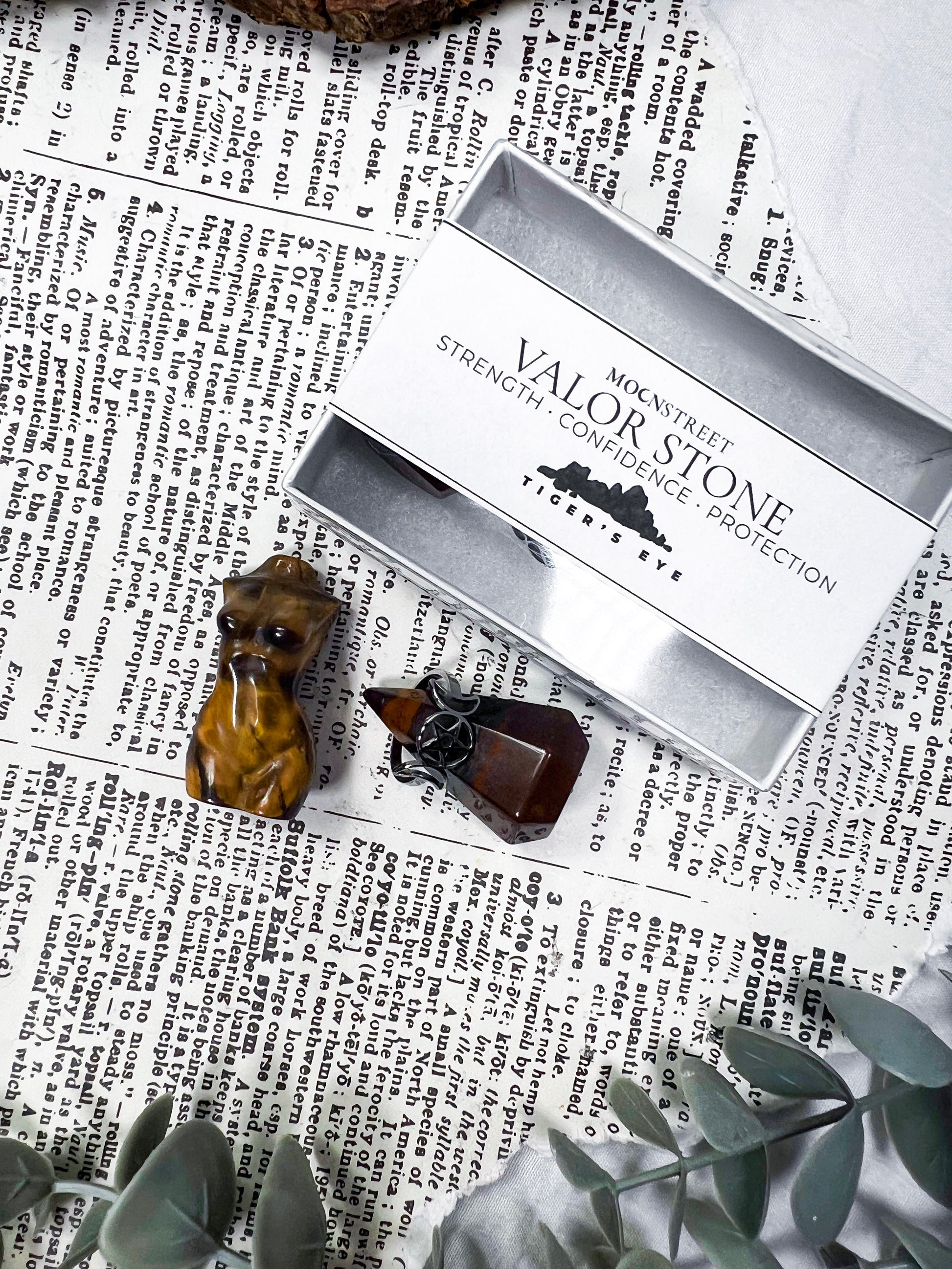 The Tiger’s Eye Mini Set embodies strength, protection, and courage. Includes a tiger’s eye goddess carving, matching ring holder, and a silver adjustable triple moon ring.