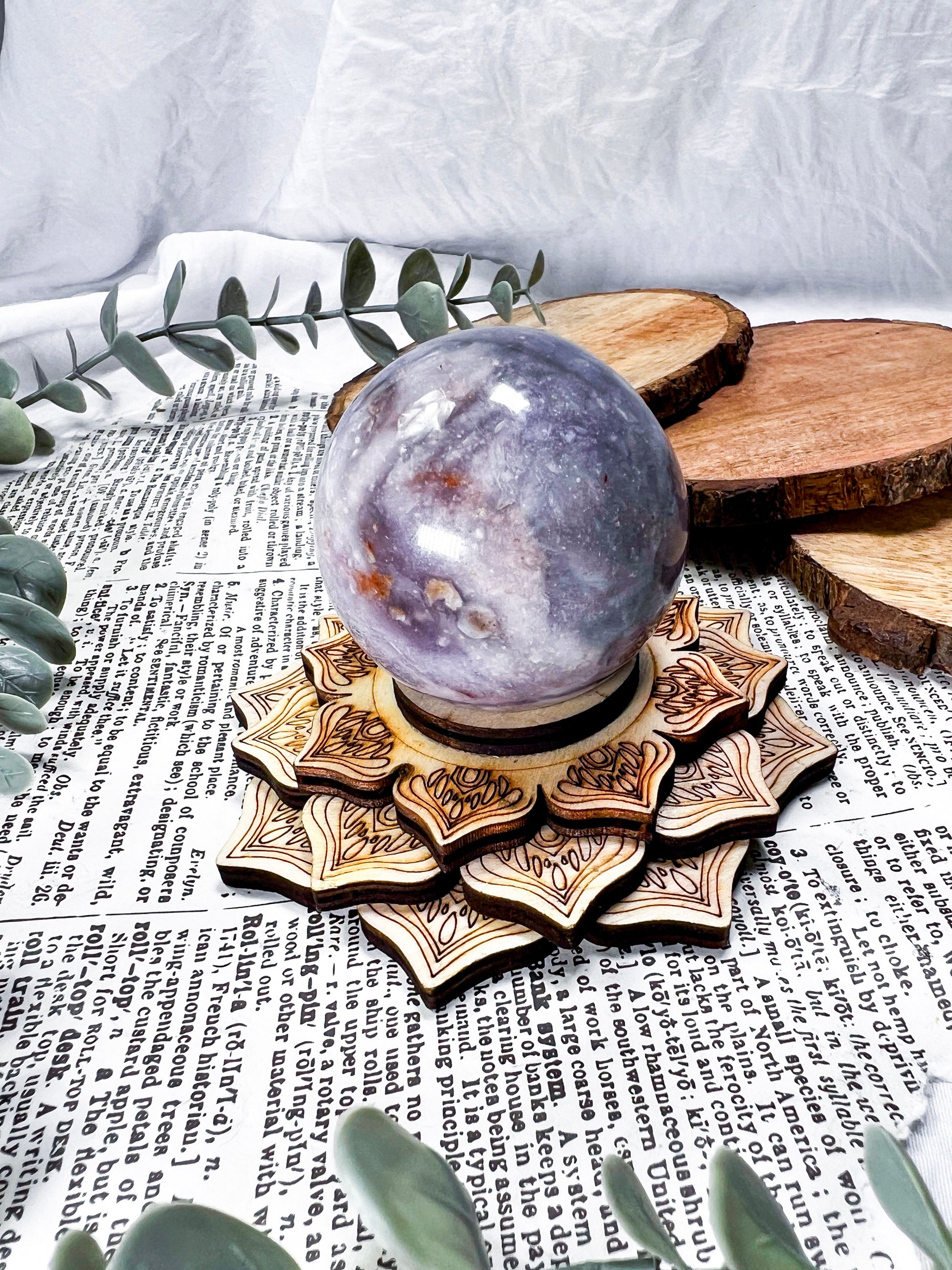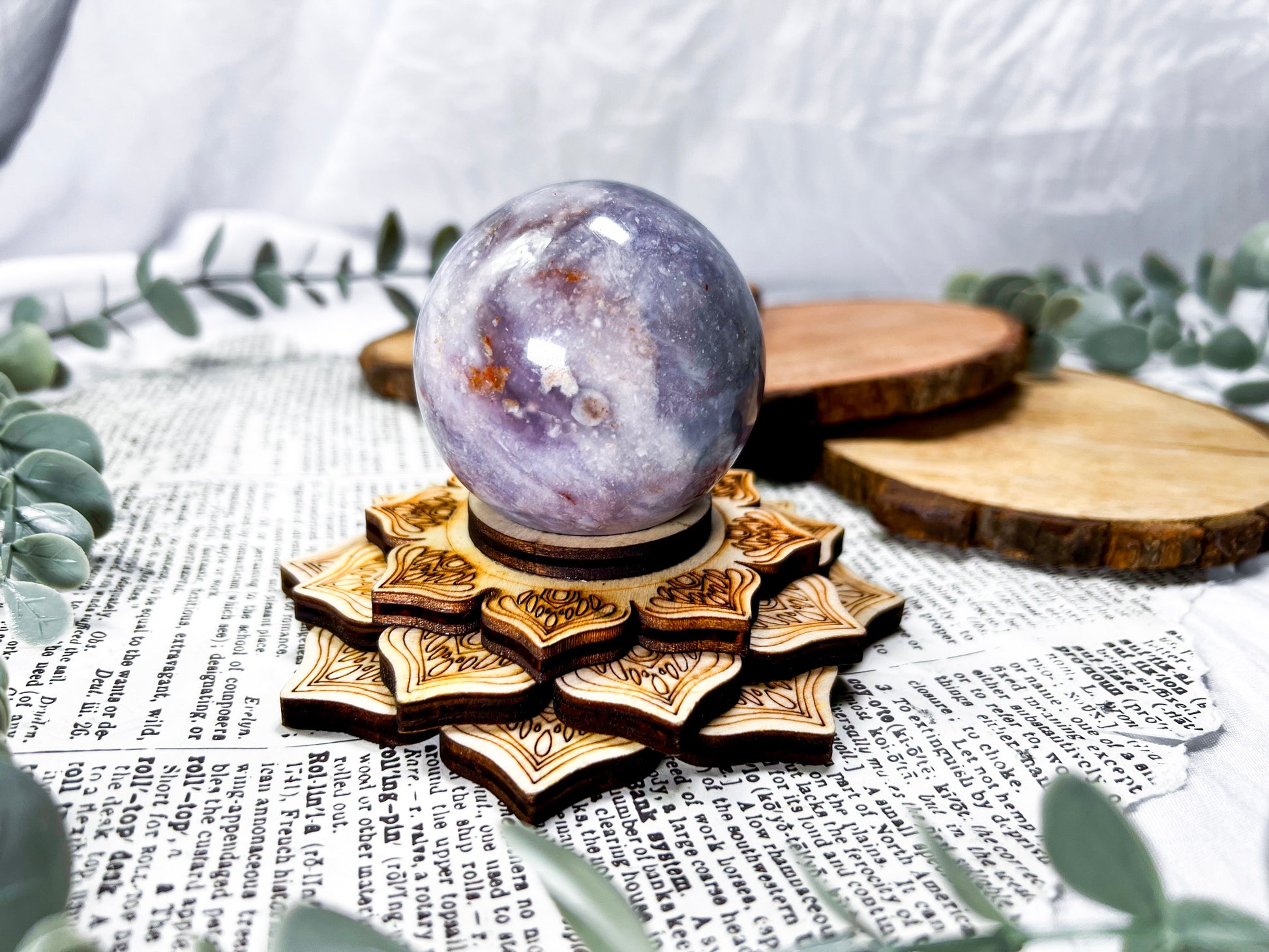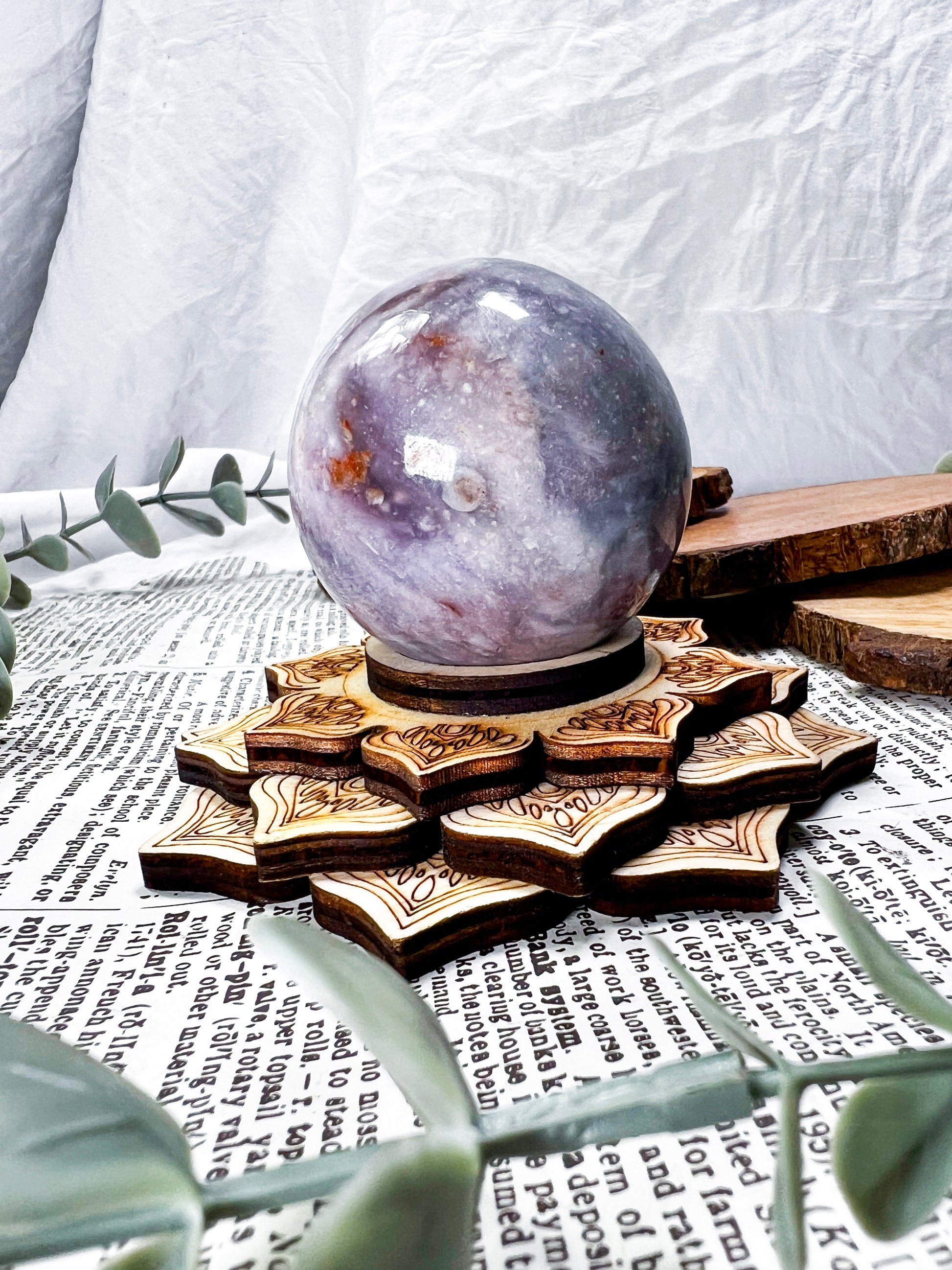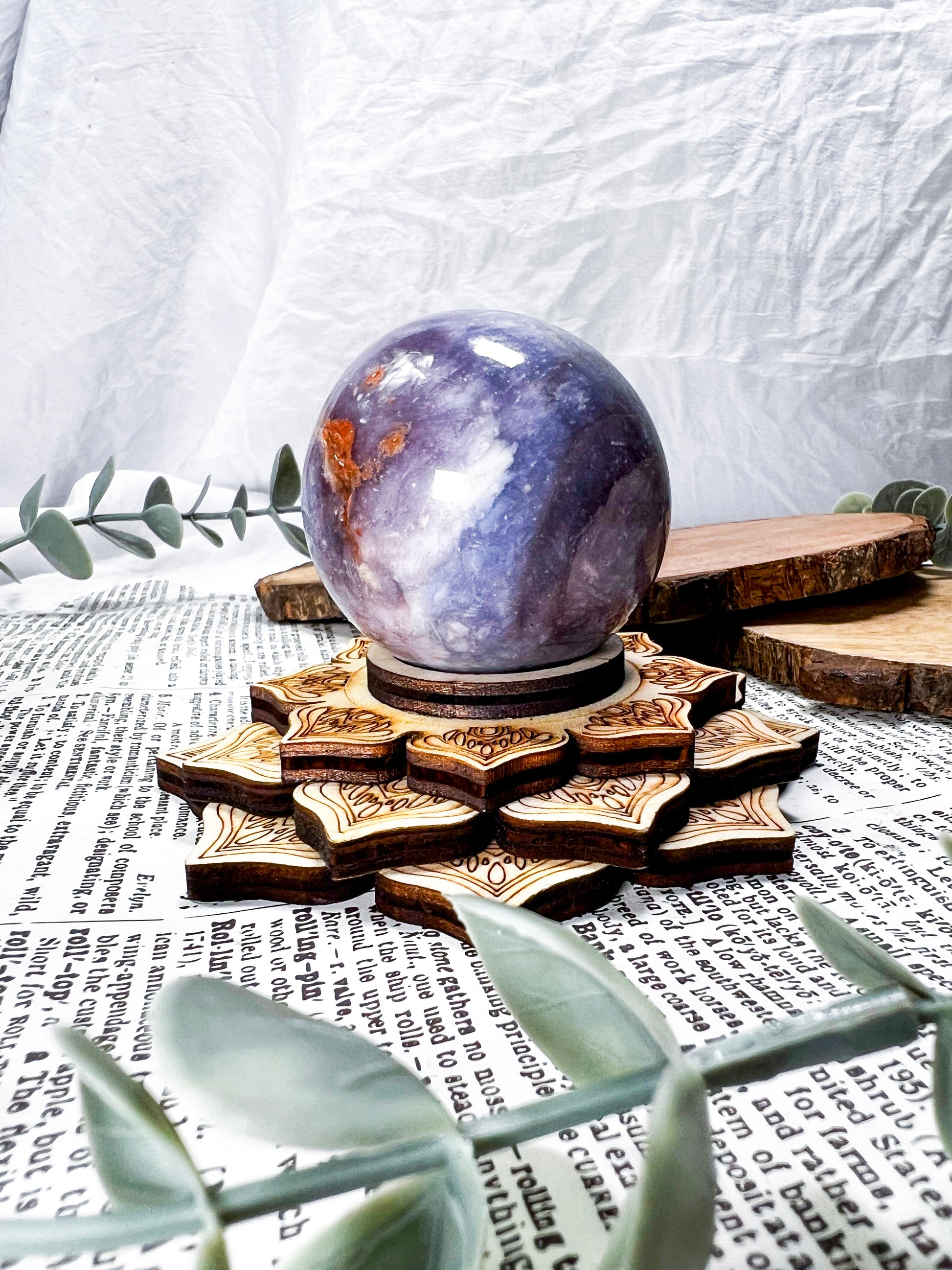 unicorn stone · lepidolite · pink tourmaline · emotional healing · calming crystal · wooden lotus stand · meditation decor · pastel crystal · peace and balance · handmade crystal sphere · witchy home decor · self love energy