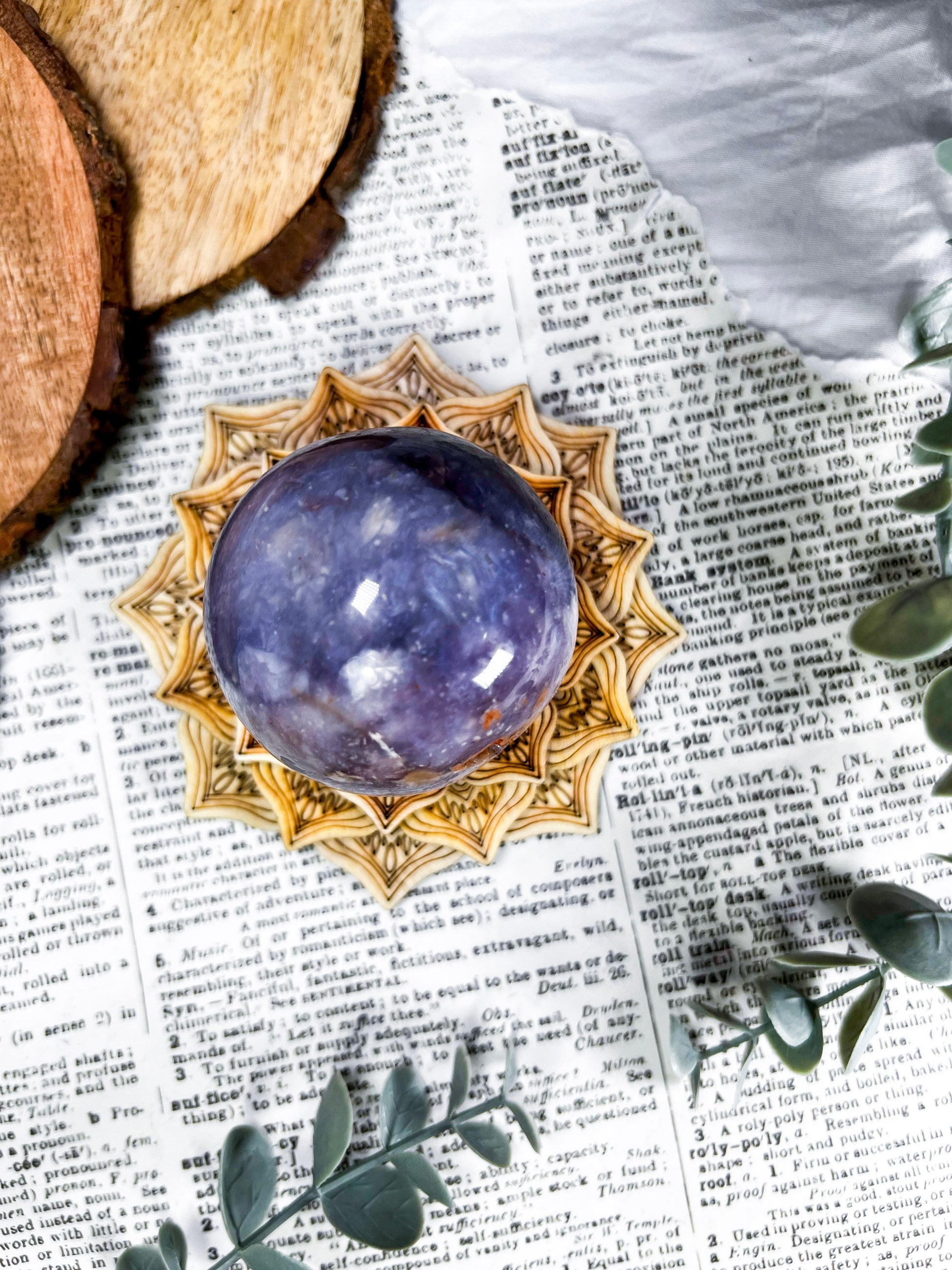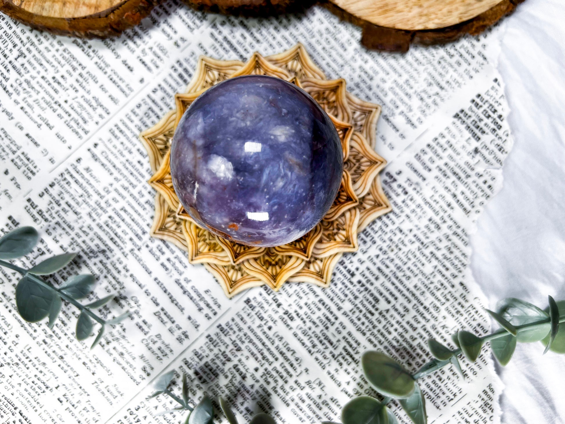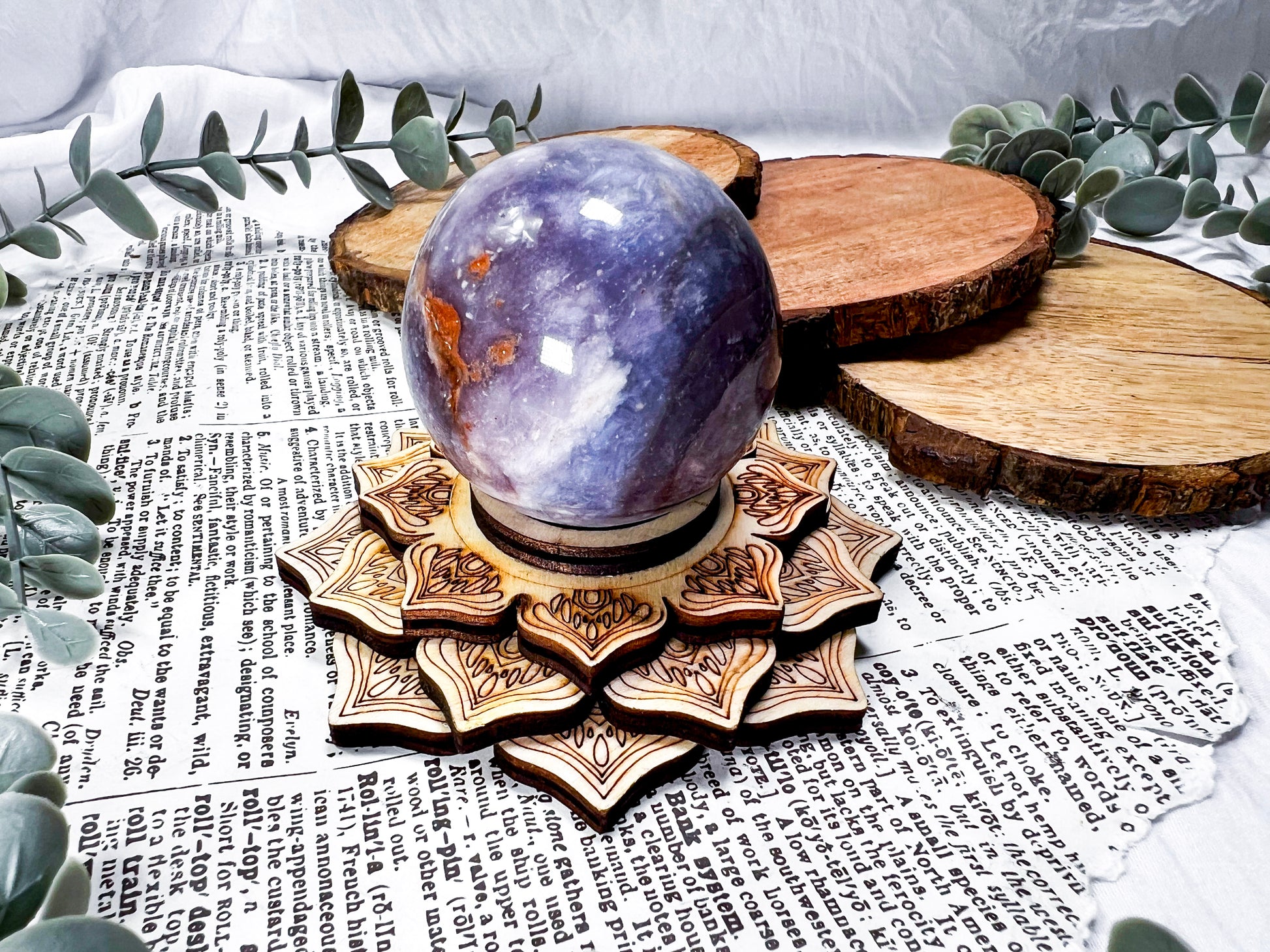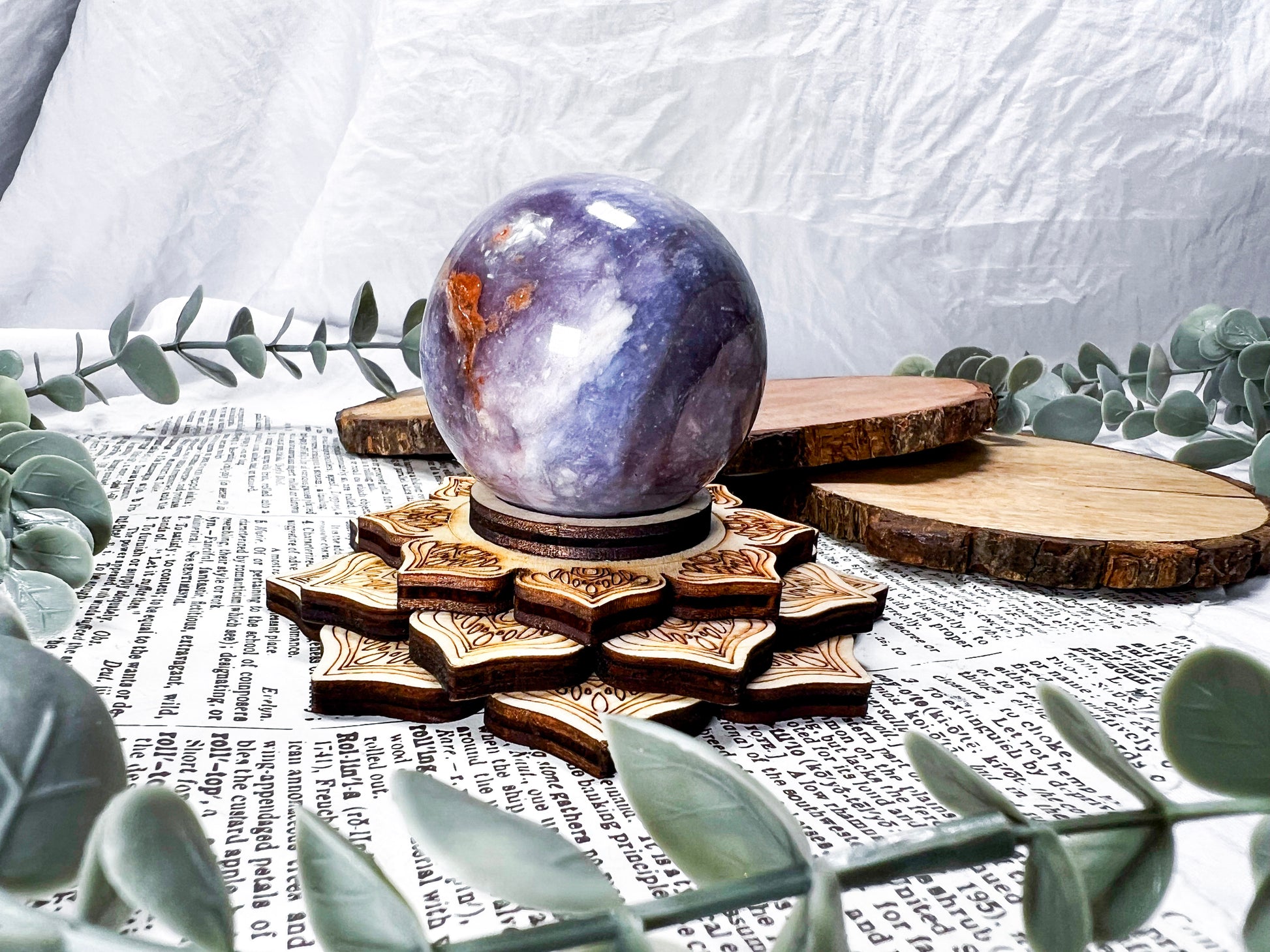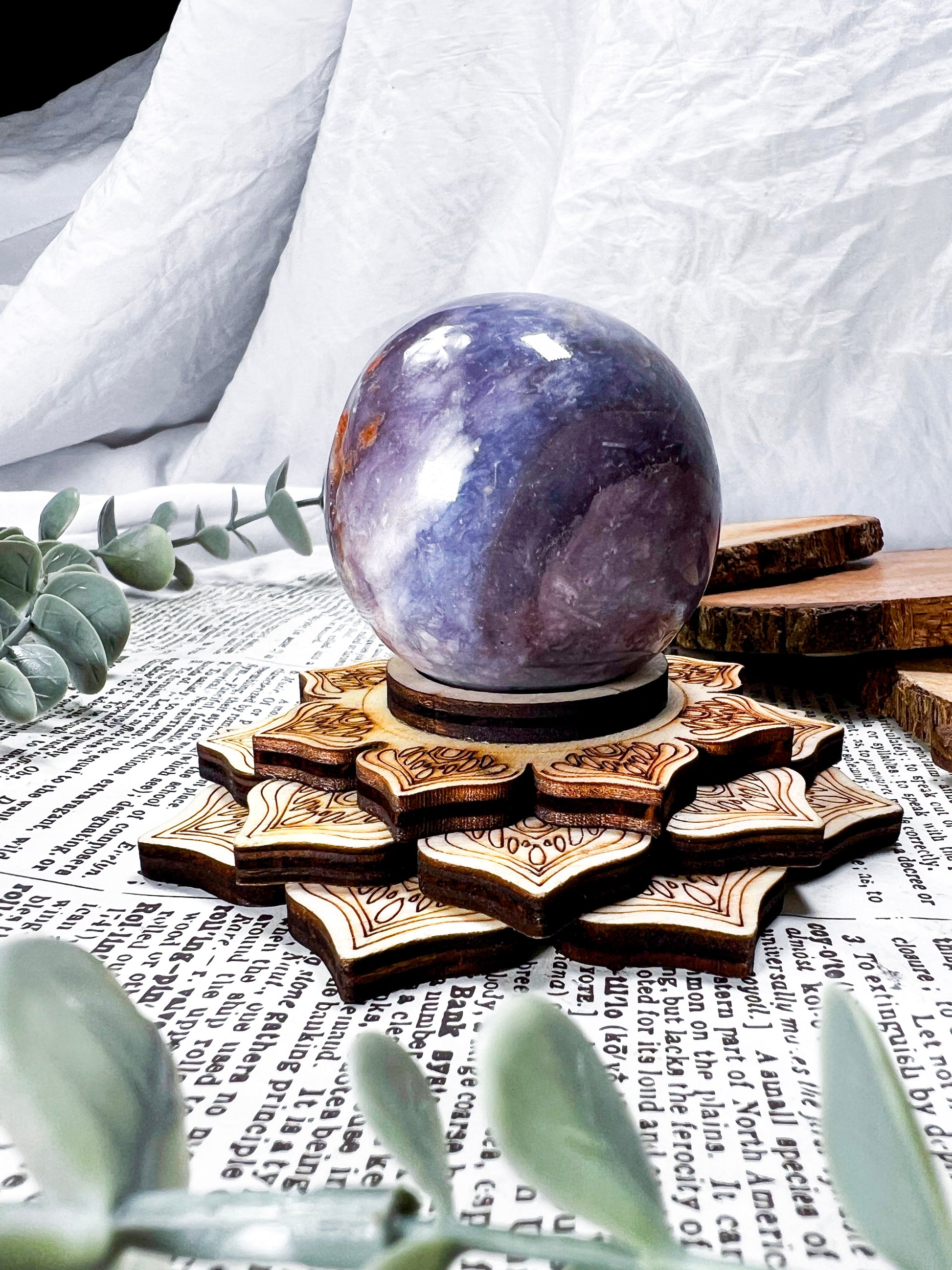 unicorn stone · lepidolite · pink tourmaline · emotional healing · calming crystal · wooden lotus stand · meditation decor · pastel crystal · peace and balance · handmade crystal sphere · witchy home decor · self love energy