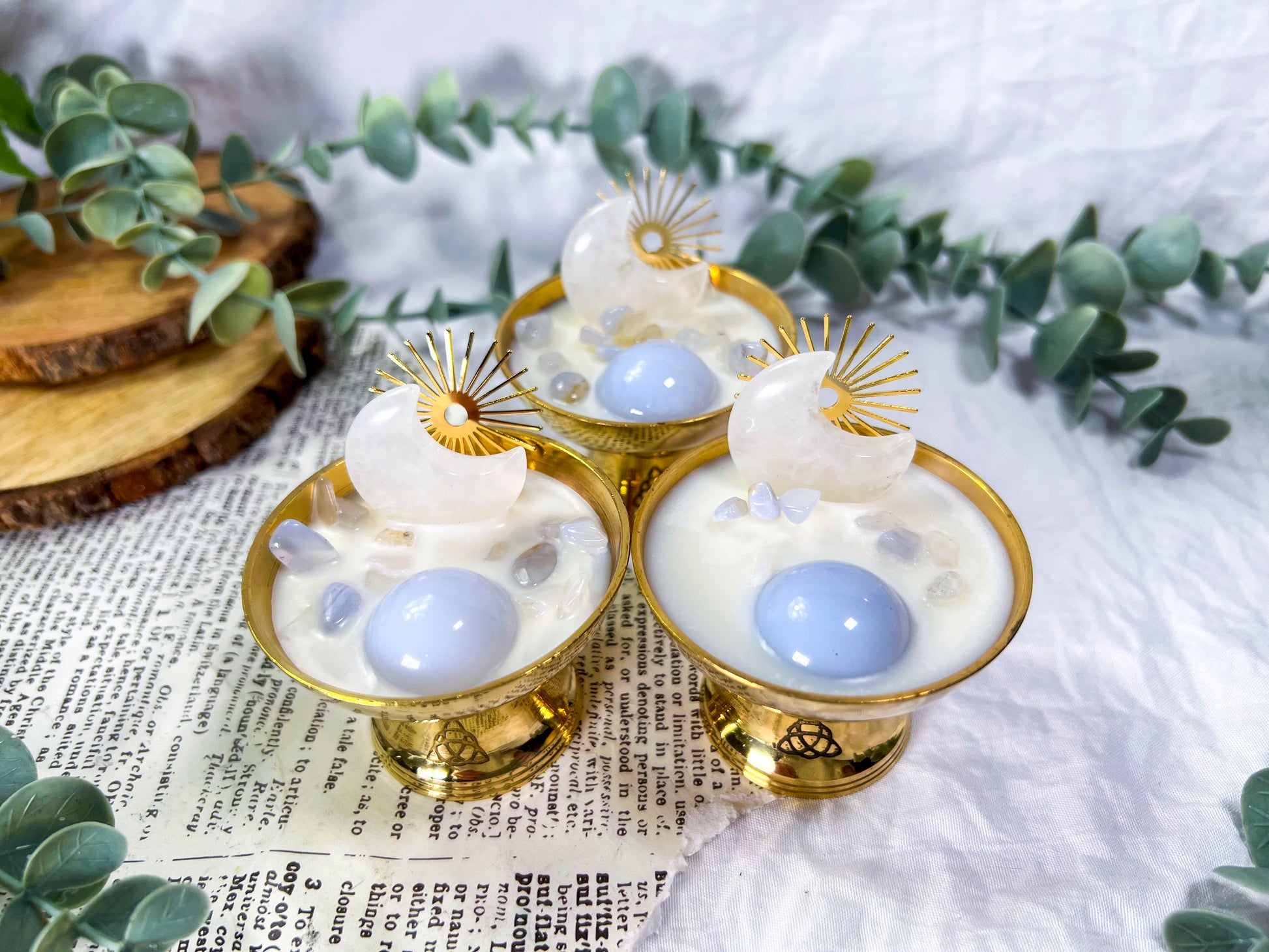 Clear quartz moon | Blue chalcedony half dome | Blue lace agate chips